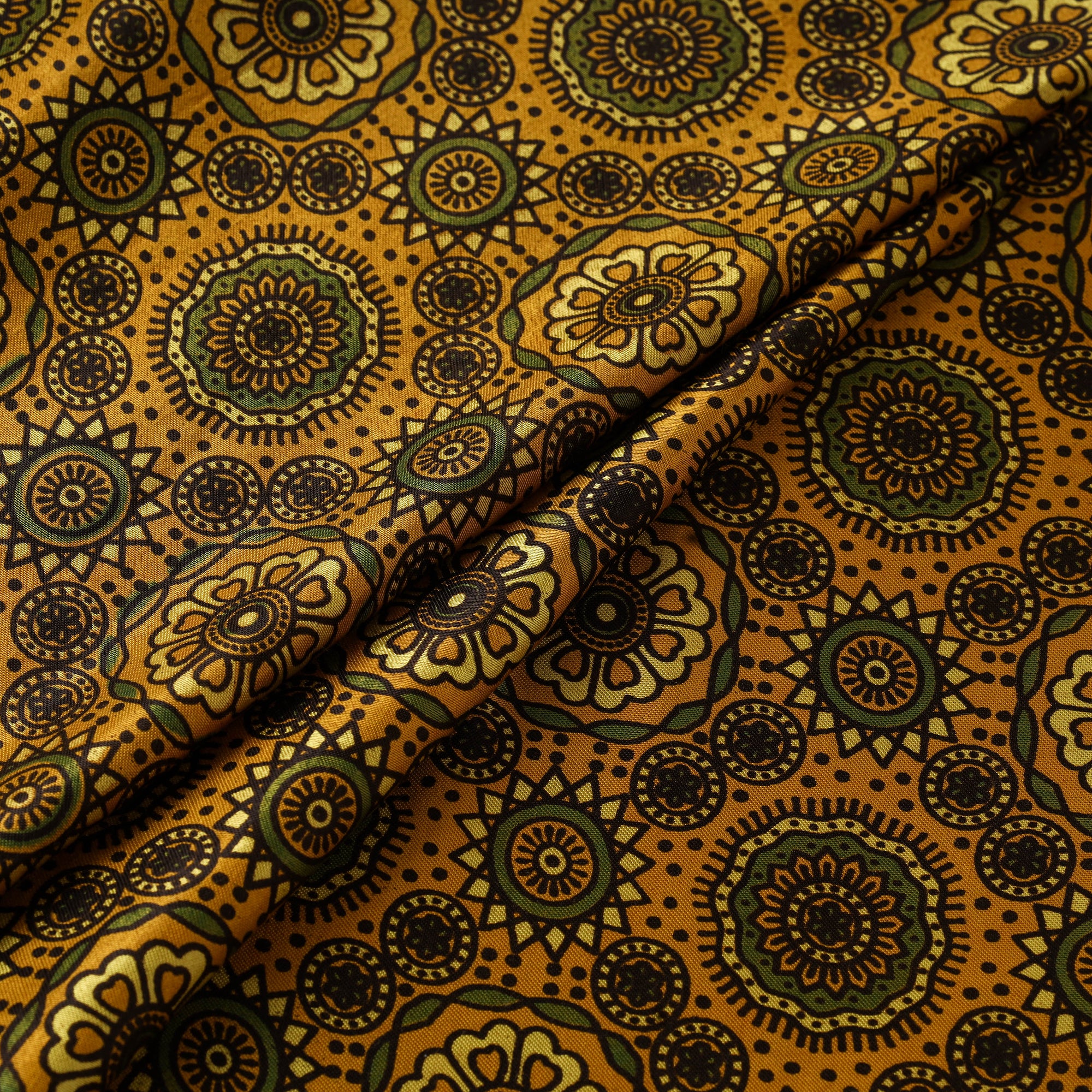 Ajrakh fabric crafted using natural-dyeing and resist block-printing techniques. This ancient craft is estimated to be around 4,500 years old. The Ajrakh artisans in India originally migrated from Sindh to the Kutch region of Gujarat and to Barmer in Rajasthan. Ajrakh is also the traditional attire of the Maldhari pastoral community of Bhuj. The process is long and detailed, involving multiple stages where each layer of colour is printed only after a resting period, allowing the cloth to absorb the dye fully. Made of mashru silk, which blends the richness of silk with the comfort of cotton, it is ideal for creating kurtas, shirts, dresses or even home decor items.