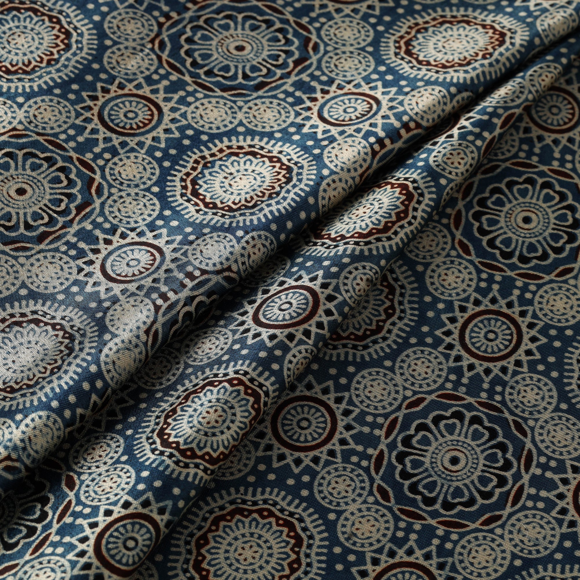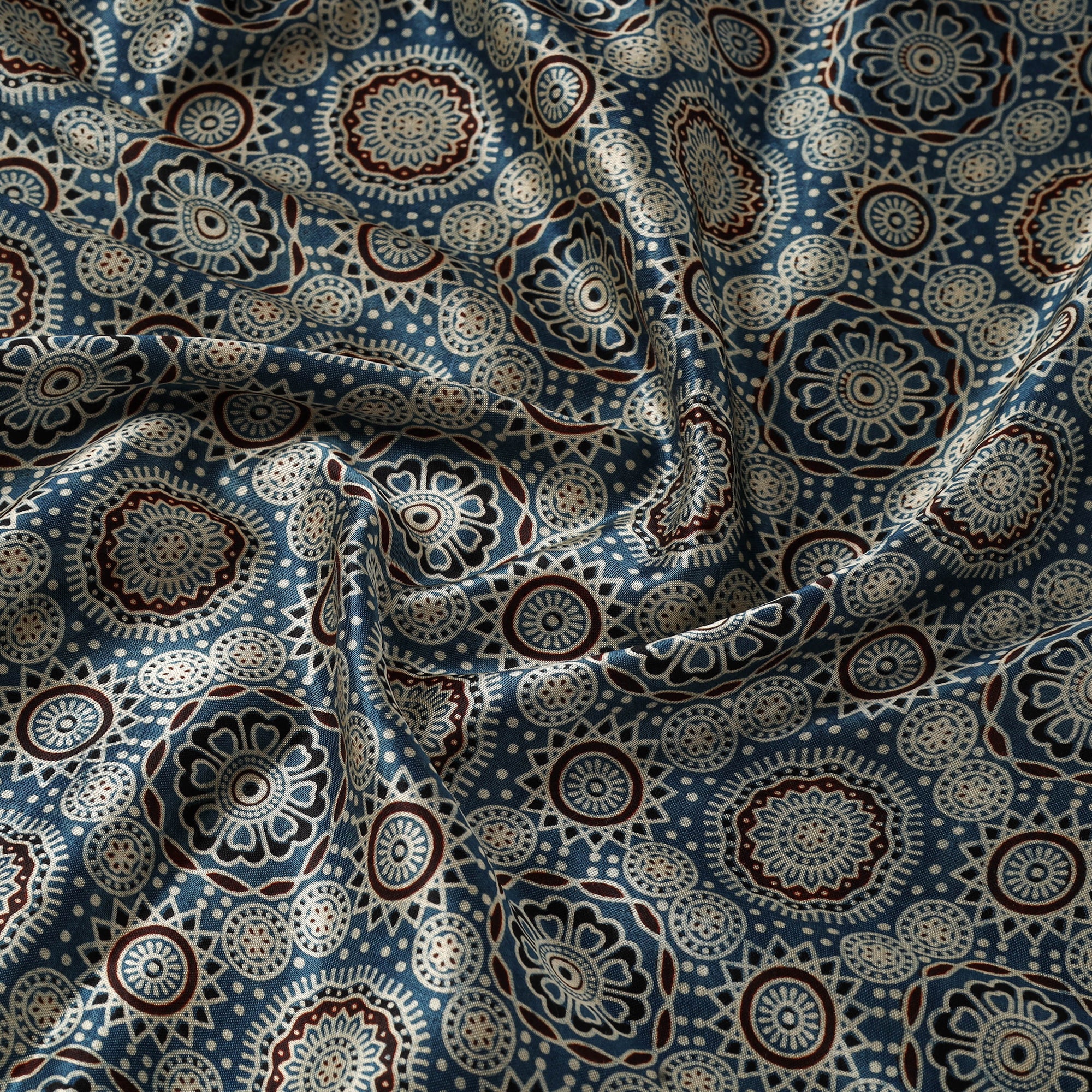 Ajrakh fabric crafted using natural-dyeing and resist block-printing techniques. This ancient craft is estimated to be around 4,500 years old. The Ajrakh artisans in India originally migrated from Sindh to the Kutch region of Gujarat and to Barmer in Rajasthan. Ajrakh is also the traditional attire of the Maldhari pastoral community of Bhuj. The process is long and detailed, involving multiple stages where each layer of colour is printed only after a resting period, allowing the cloth to absorb the dye fully. Made of mashru silk, which blends the richness of silk with the comfort of cotton, it is ideal for creating kurtas, shirts, dresses or even home decor items.