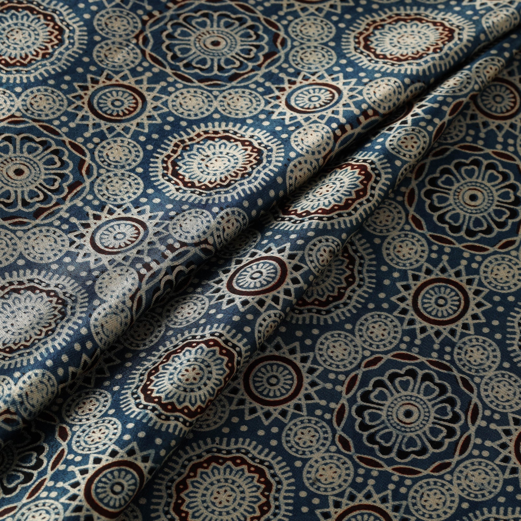 Blue ajrakh fabric crafted using natural-dyeing and resist block-printing techniques. This ancient craft is estimated to be around 4,500 years old. The Ajrakh artisans in India originally migrated from Sindh to the Kutch region of Gujarat and to Barmer in Rajasthan. Ajrakh is also the traditional attire of the Maldhari pastoral community of Bhuj. The process is long and detailed, involving multiple stages where each layer of colour is printed only after a resting period, allowing the cloth to absorb the dye fully. Made of mashru silk, which blends the richness of silk with the comfort of cotton, it is ideal for creating kurtas, shirts, dresses or even home decor items.