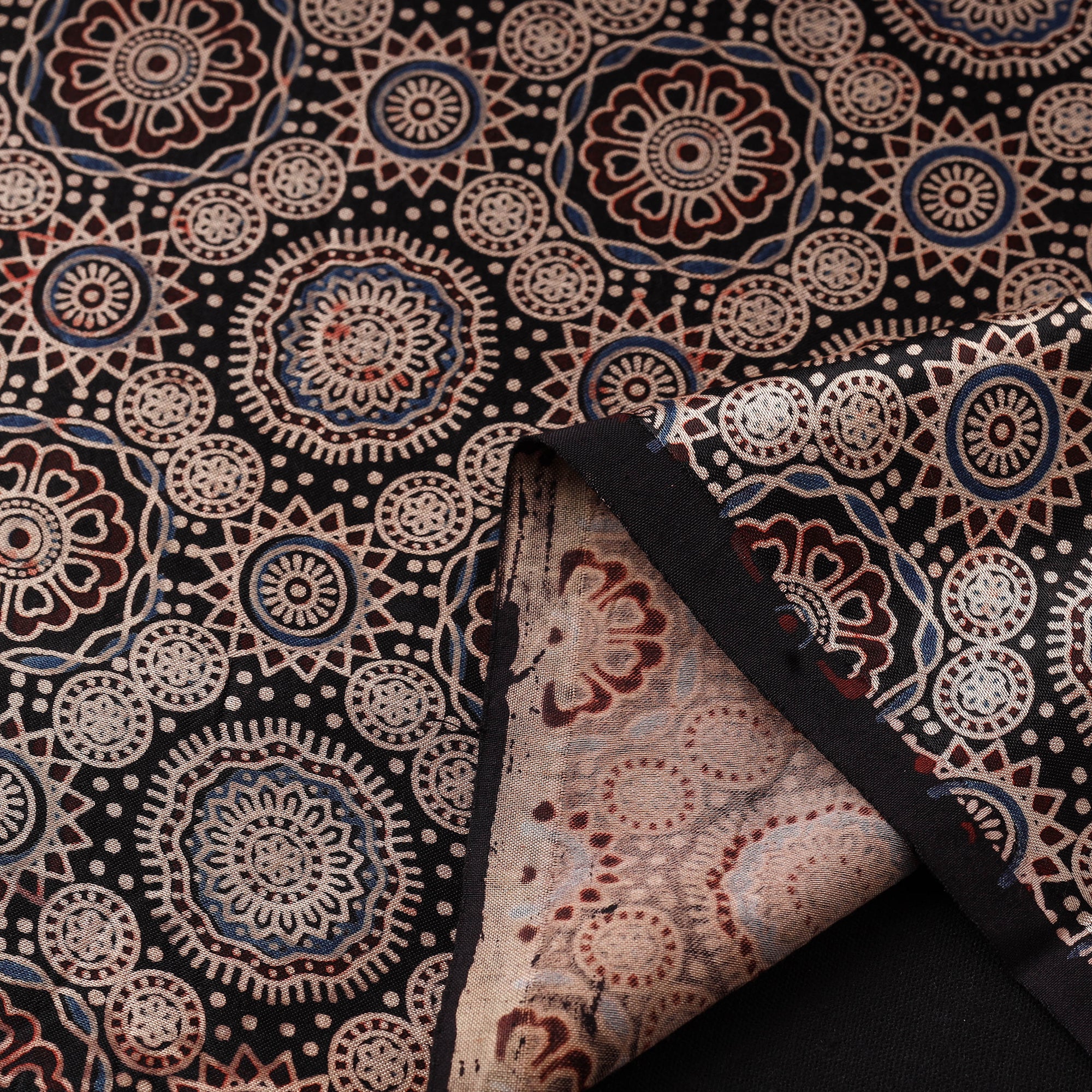 Ajrakh fabric crafted using natural-dyeing and resist block-printing techniques. This ancient craft is estimated to be around 4,500 years old. The Ajrakh artisans in India originally migrated from Sindh to the Kutch region of Gujarat and to Barmer in Rajasthan. Ajrakh is also the traditional attire of the Maldhari pastoral community of Bhuj. The process is long and detailed, involving multiple stages where each layer of colour is printed only after a resting period, allowing the cloth to absorb the dye fully. Made of mashru silk, which blends the richness of silk with the comfort of cotton, it is ideal for creating kurtas, shirts, dresses or even home decor items.