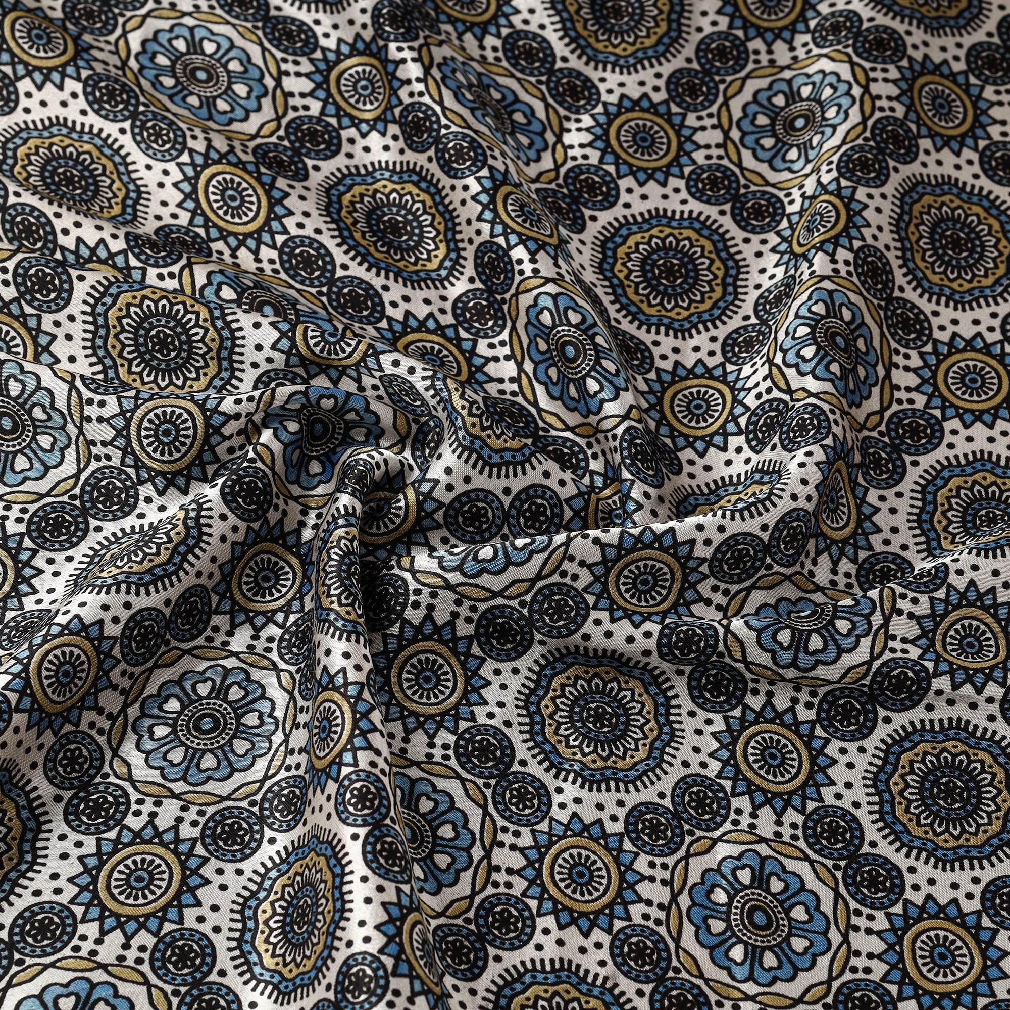 Ajrakh fabric crafted using natural-dyeing and resist block-printing techniques. This ancient craft is estimated to be around 4,500 years old. The Ajrakh artisans in India originally migrated from Sindh to the Kutch region of Gujarat and to Barmer in Rajasthan. Ajrakh is also the traditional attire of the Maldhari pastoral community of Bhuj. The process is long and detailed, involving multiple stages where each layer of colour is printed only after a resting period, allowing the cloth to absorb the dye fully. Made of mashru silk, which blends the richness of silk with the comfort of cotton, it is ideal for creating kurtas, shirts, dresses or even home decor items.