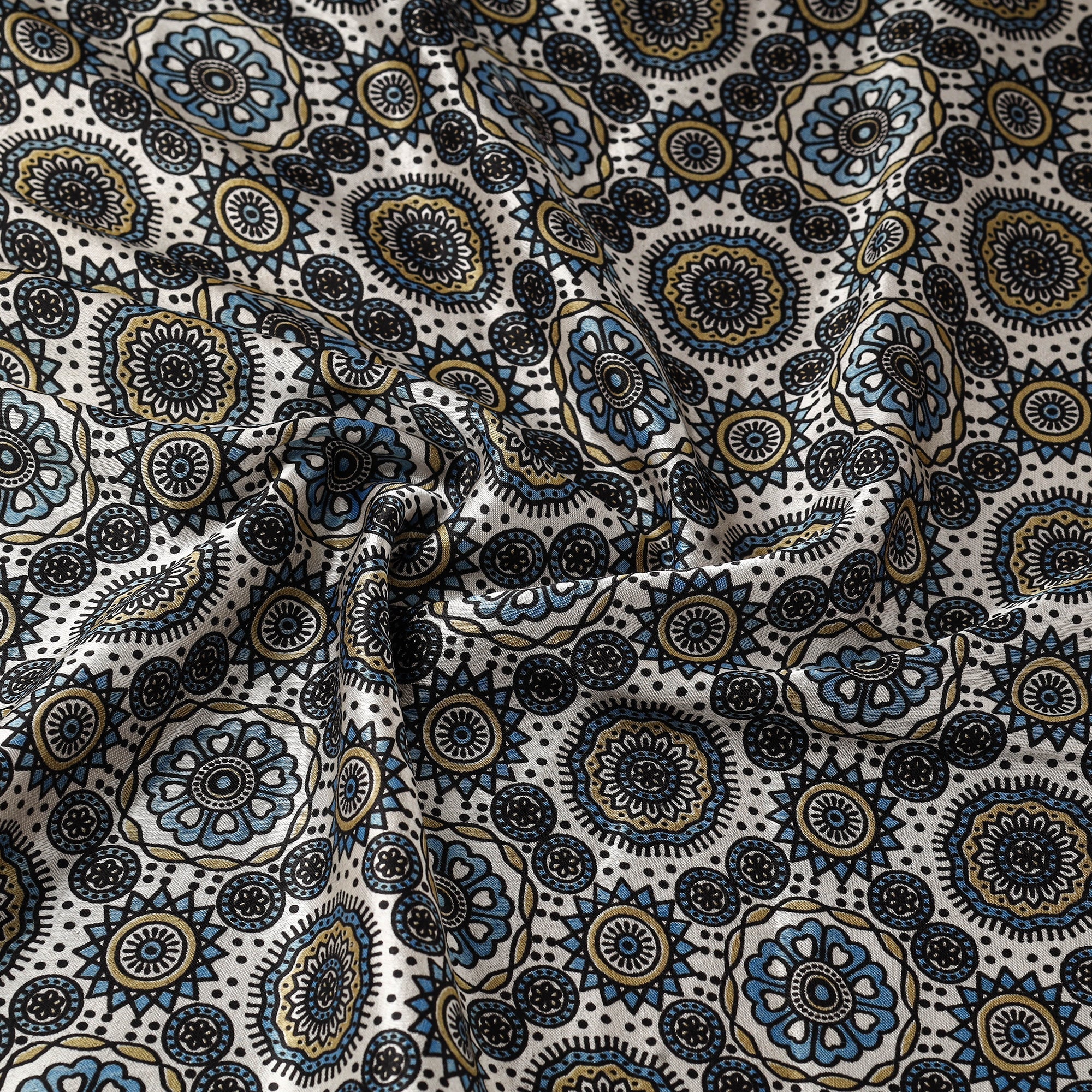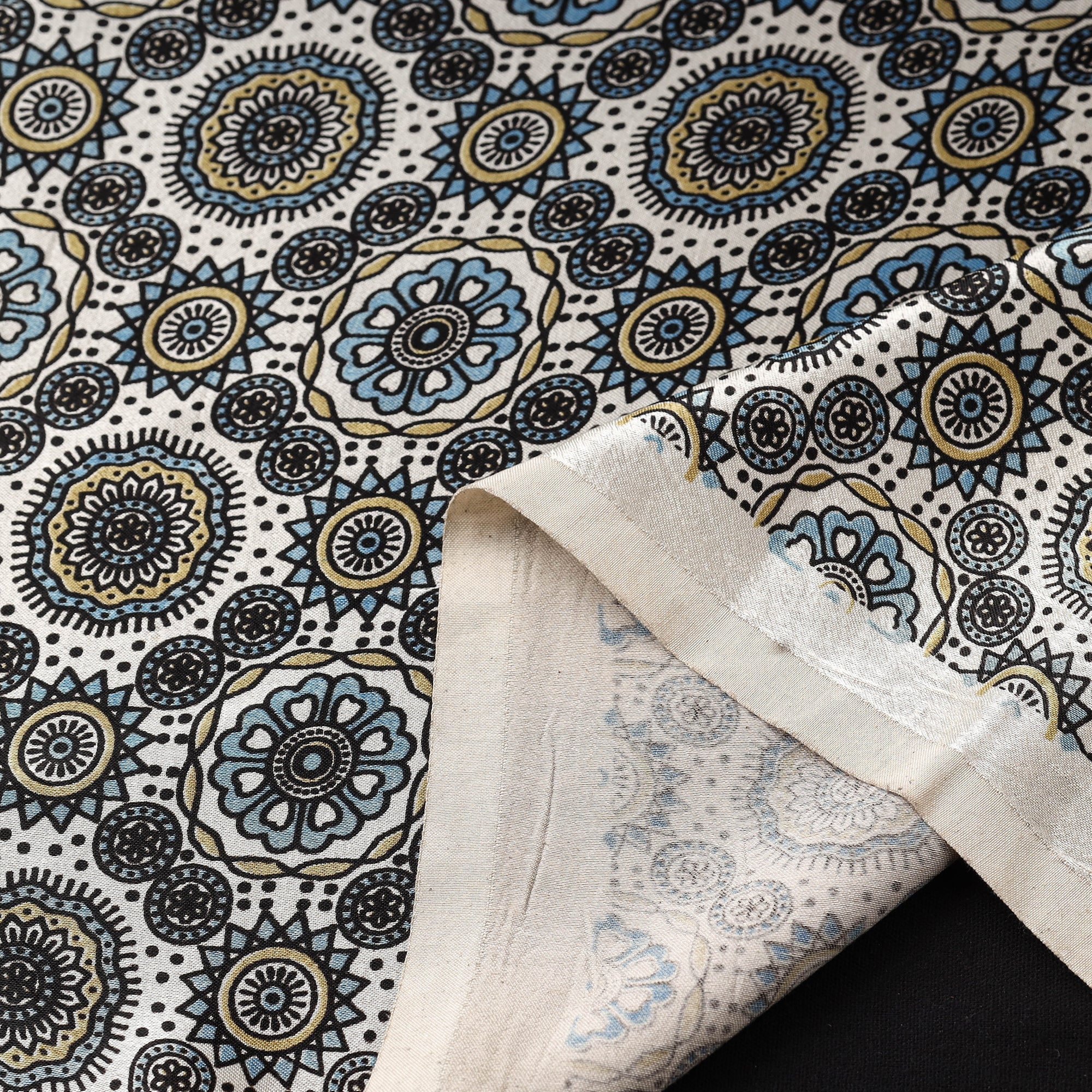 Beige ajrakh fabric crafted using natural-dyeing and resist block-printing techniques. This ancient craft is estimated to be around 4,500 years old. The Ajrakh artisans in India originally migrated from Sindh to the Kutch region of Gujarat and to Barmer in Rajasthan. Ajrakh is also the traditional attire of the Maldhari pastoral community of Bhuj. The process is long and detailed, involving multiple stages where each layer of colour is printed only after a resting period, allowing the cloth to absorb the dye fully. Made of mashru silk, which blends the richness of silk with the comfort of cotton, it is ideal for creating kurtas, shirts, dresses or even home decor items.