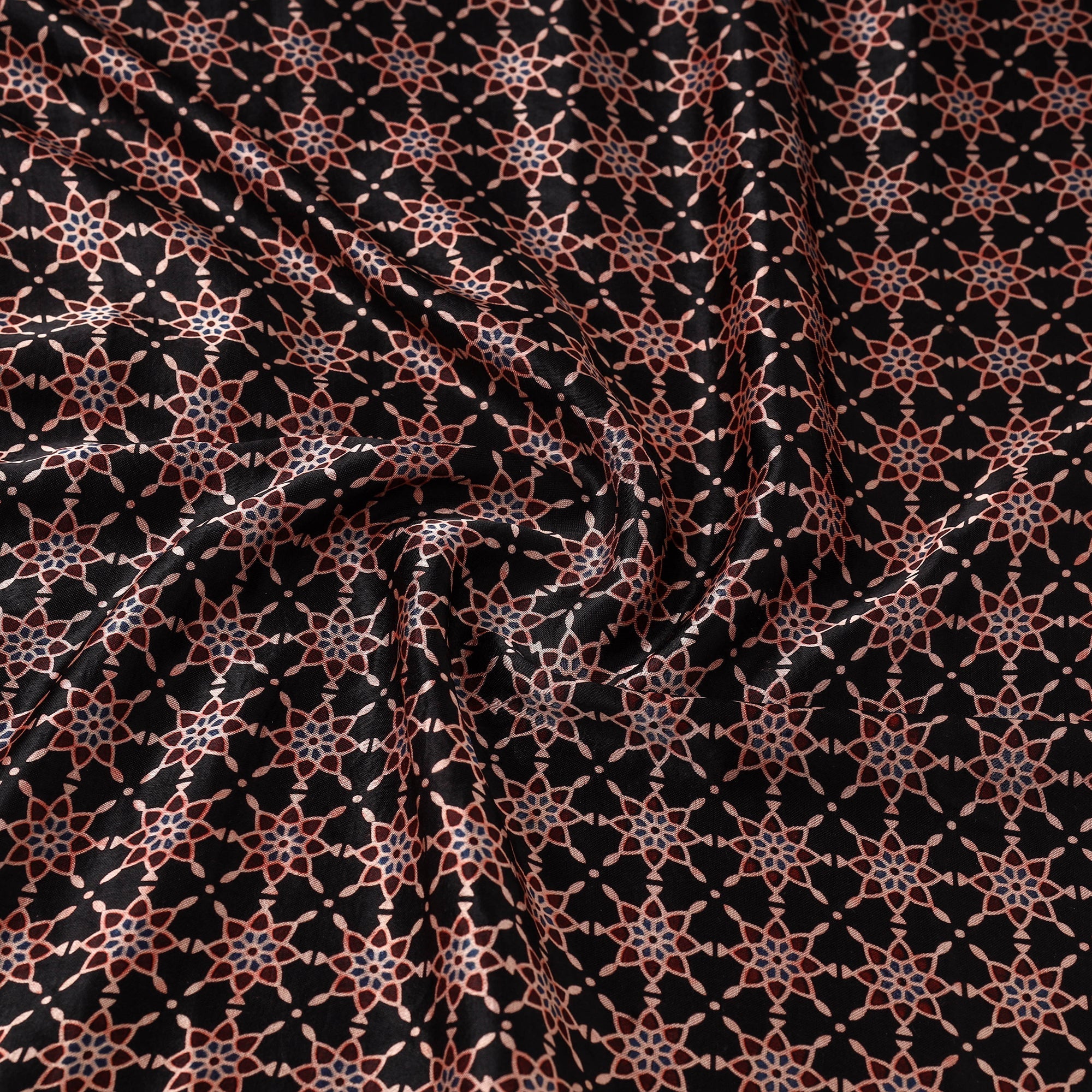 Black ajrakh fabric crafted using natural-dyeing and resist block-printing techniques. This ancient craft is estimated to be around 4,500 years old. The Ajrakh artisans in India originally migrated from Sindh to the Kutch region of Gujarat and to Barmer in Rajasthan. Ajrakh is also the traditional attire of the Maldhari pastoral community of Bhuj. The process is long and detailed, involving multiple stages where each layer of colour is printed only after a resting period, allowing the cloth to absorb the dye fully. Made of mashru silk, which blends the richness of silk with the comfort of cotton, it is ideal for creating kurtas, shirts, dresses or even home decor items.