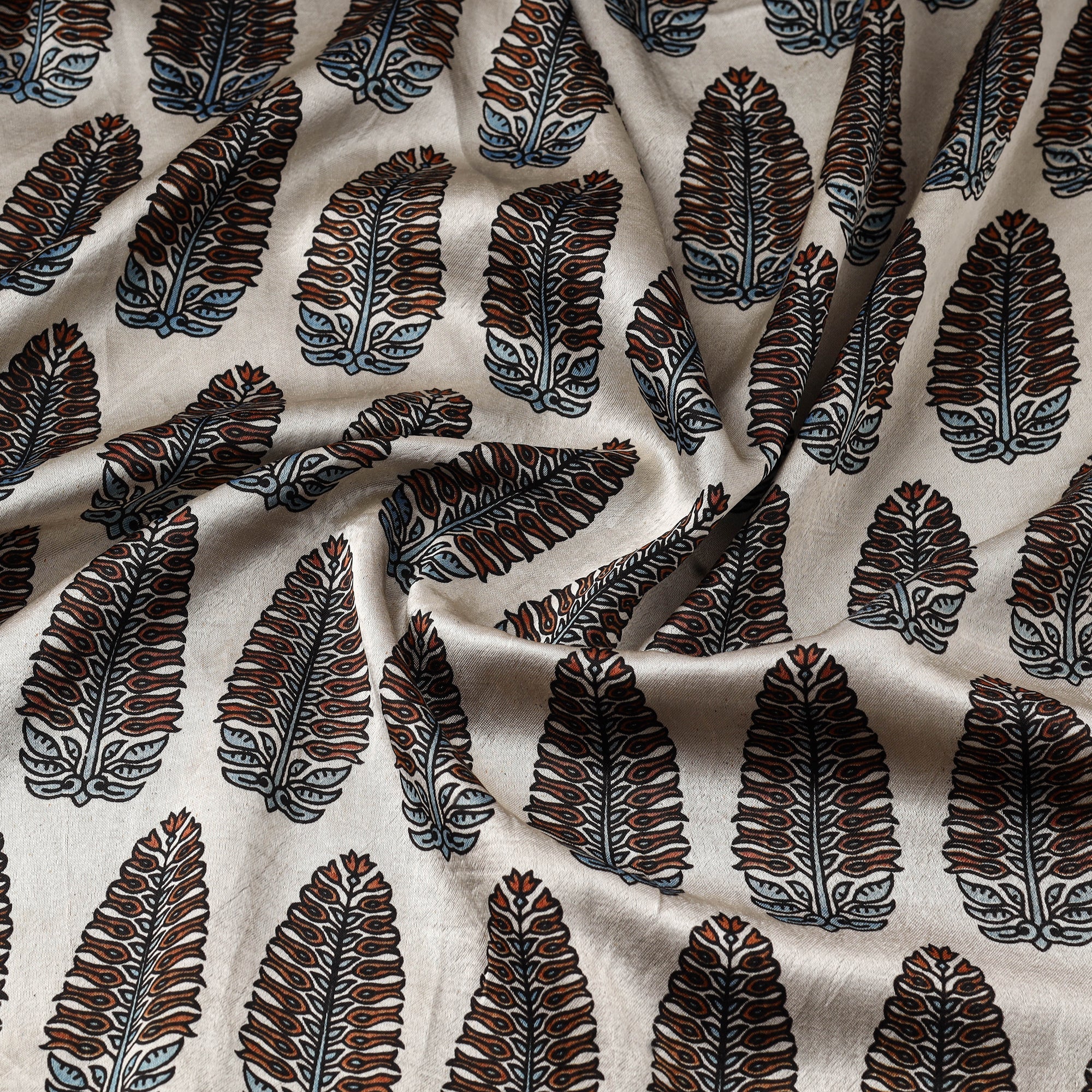 Beige ajrakh fabric crafted using natural-dyeing and resist block-printing techniques. This ancient craft is estimated to be around 4,500 years old. The Ajrakh artisans in India originally migrated from Sindh to the Kutch region of Gujarat and to Barmer in Rajasthan. Ajrakh is also the traditional attire of the Maldhari pastoral community of Bhuj. The process is long and detailed, involving multiple stages where each layer of colour is printed only after a resting period, allowing the cloth to absorb the dye fully. Made of mashru silk, which blends the richness of silk with the comfort of cotton, it is ideal for creating kurtas, shirts, dresses or even home decor items.