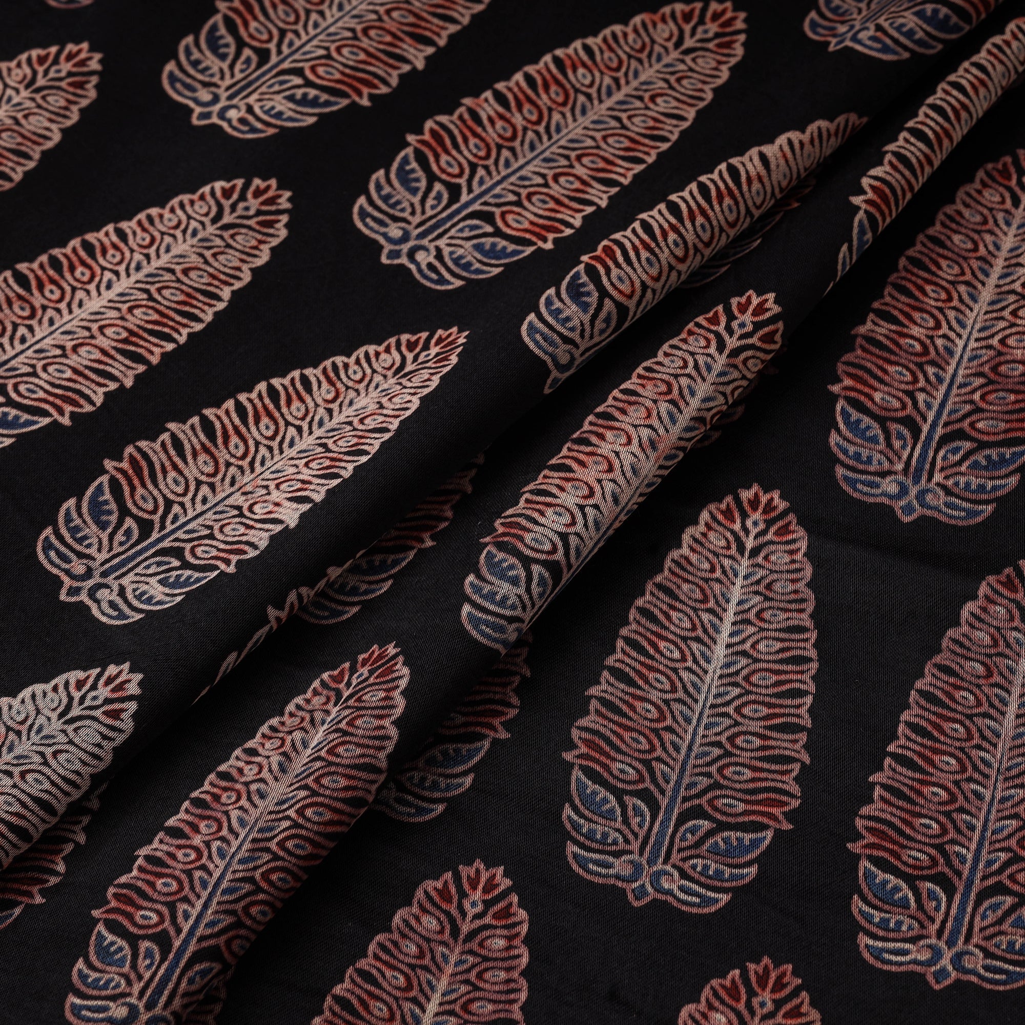 Black ajrakh fabric crafted using natural-dyeing and resist block-printing techniques. This ancient craft is estimated to be around 4,500 years old. The Ajrakh artisans in India originally migrated from Sindh to the Kutch region of Gujarat and to Barmer in Rajasthan. Ajrakh is also the traditional attire of the Maldhari pastoral community of Bhuj. The process is long and detailed, involving multiple stages where each layer of colour is printed only after a resting period, allowing the cloth to absorb the dye fully. Made of mashru silk, which blends the richness of silk with the comfort of cotton, it is ideal for creating kurtas, shirts, dresses or even home decor items.