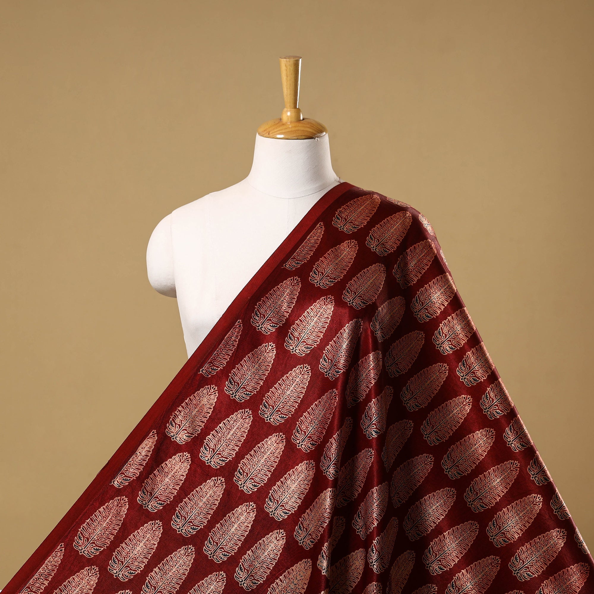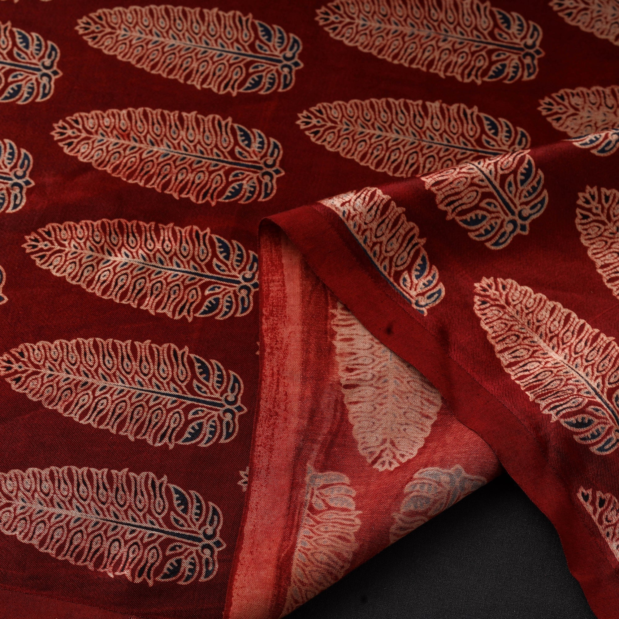 Red ajrakh fabric crafted using natural-dyeing and resist block-printing techniques. This ancient craft is estimated to be around 4,500 years old. The Ajrakh artisans in India originally migrated from Sindh to the Kutch region of Gujarat and to Barmer in Rajasthan. Ajrakh is also the traditional attire of the Maldhari pastoral community of Bhuj. The process is long and detailed, involving multiple stages where each layer of colour is printed only after a resting period, allowing the cloth to absorb the dye fully. Made of mashru silk, which blends the richness of silk with the comfort of cotton, it is ideal for creating kurtas, shirts, dresses or even home decor items.