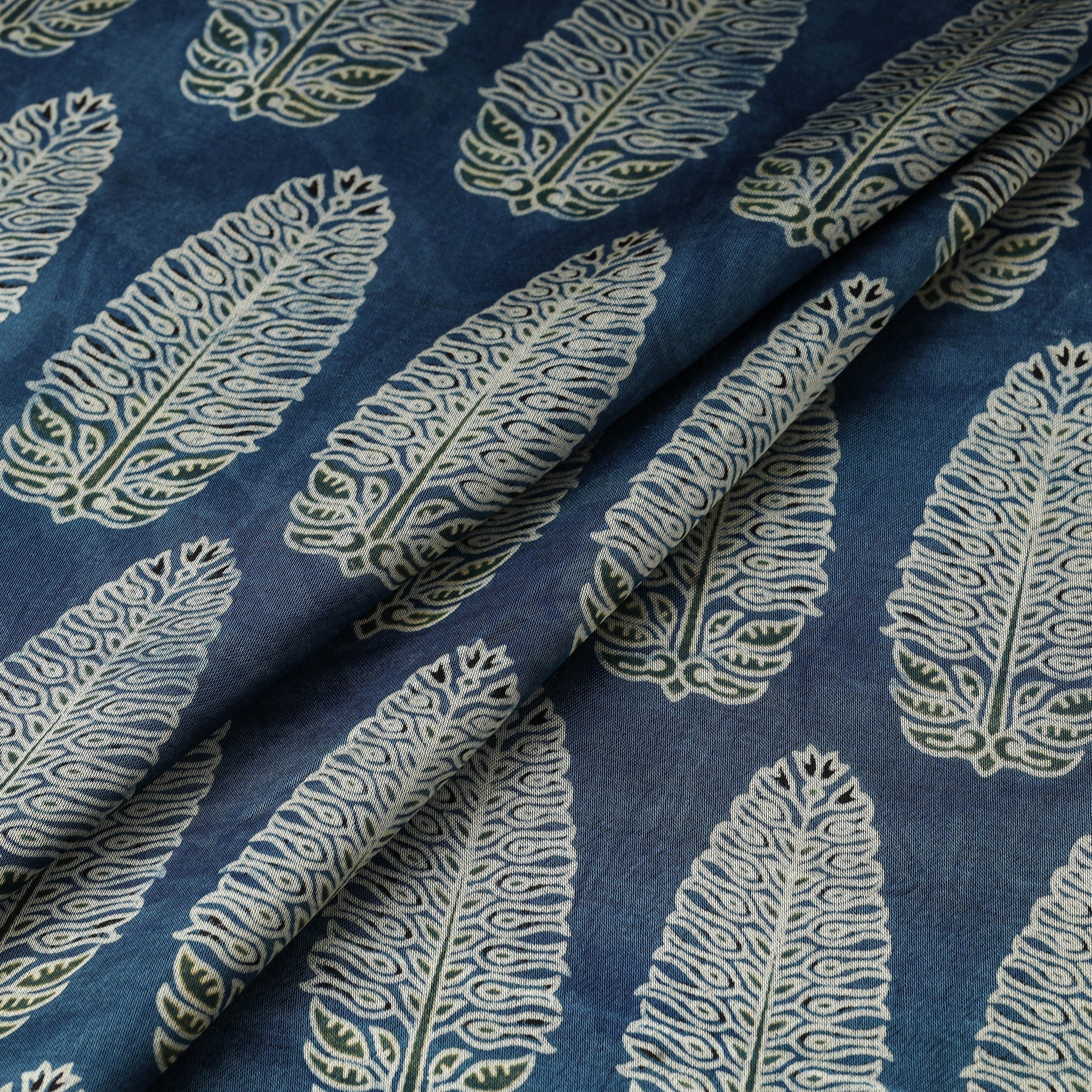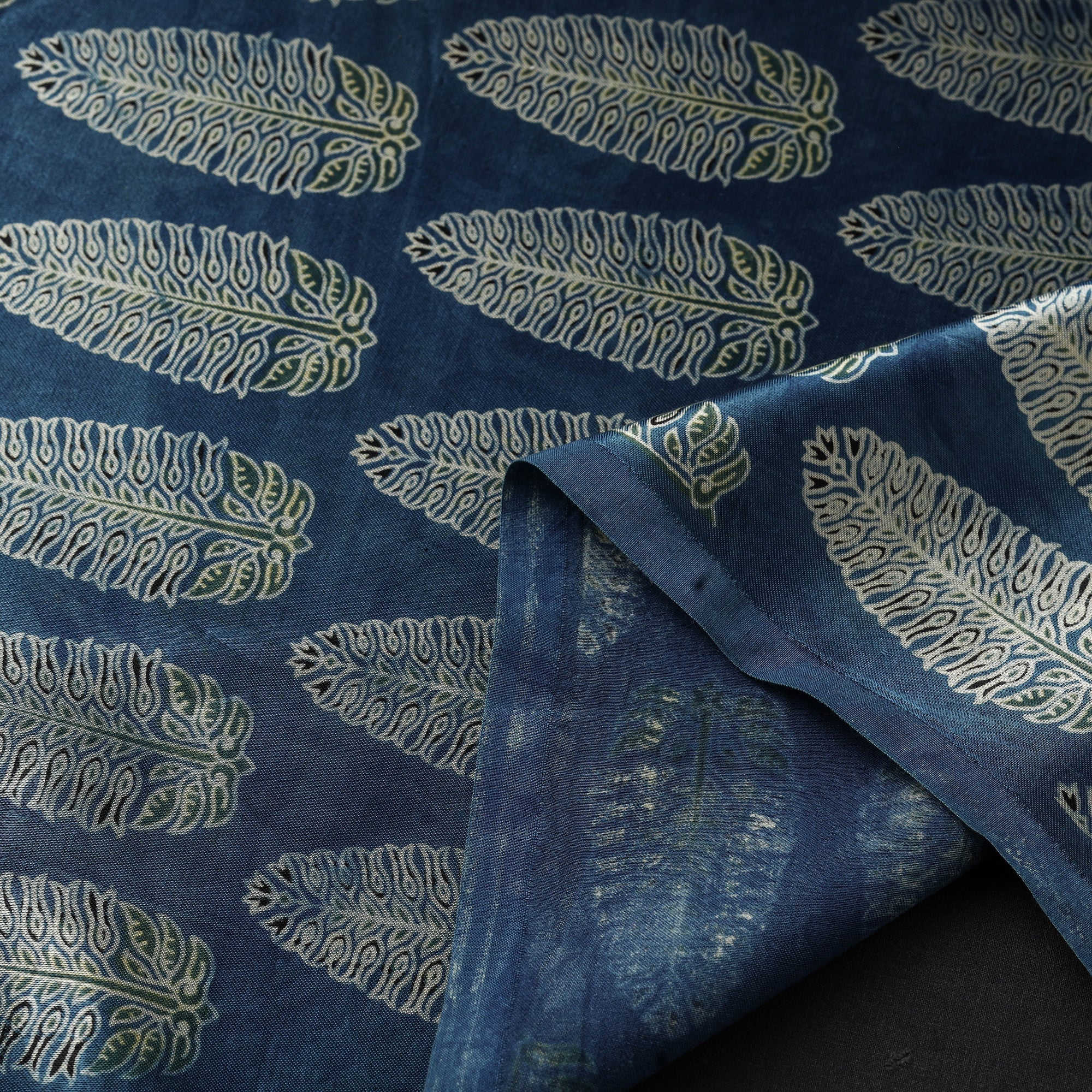 Blue ajrakh fabric crafted using natural-dyeing and resist block-printing techniques. This ancient craft is estimated to be around 4,500 years old. The Ajrakh artisans in India originally migrated from Sindh to the Kutch region of Gujarat and to Barmer in Rajasthan. Ajrakh is also the traditional attire of the Maldhari pastoral community of Bhuj. The process is long and detailed, involving multiple stages where each layer of colour is printed only after a resting period, allowing the cloth to absorb the dye fully. Made of mashru silk, which blends the richness of silk with the comfort of cotton, it is ideal for creating kurtas, shirts, dresses or even home decor items.