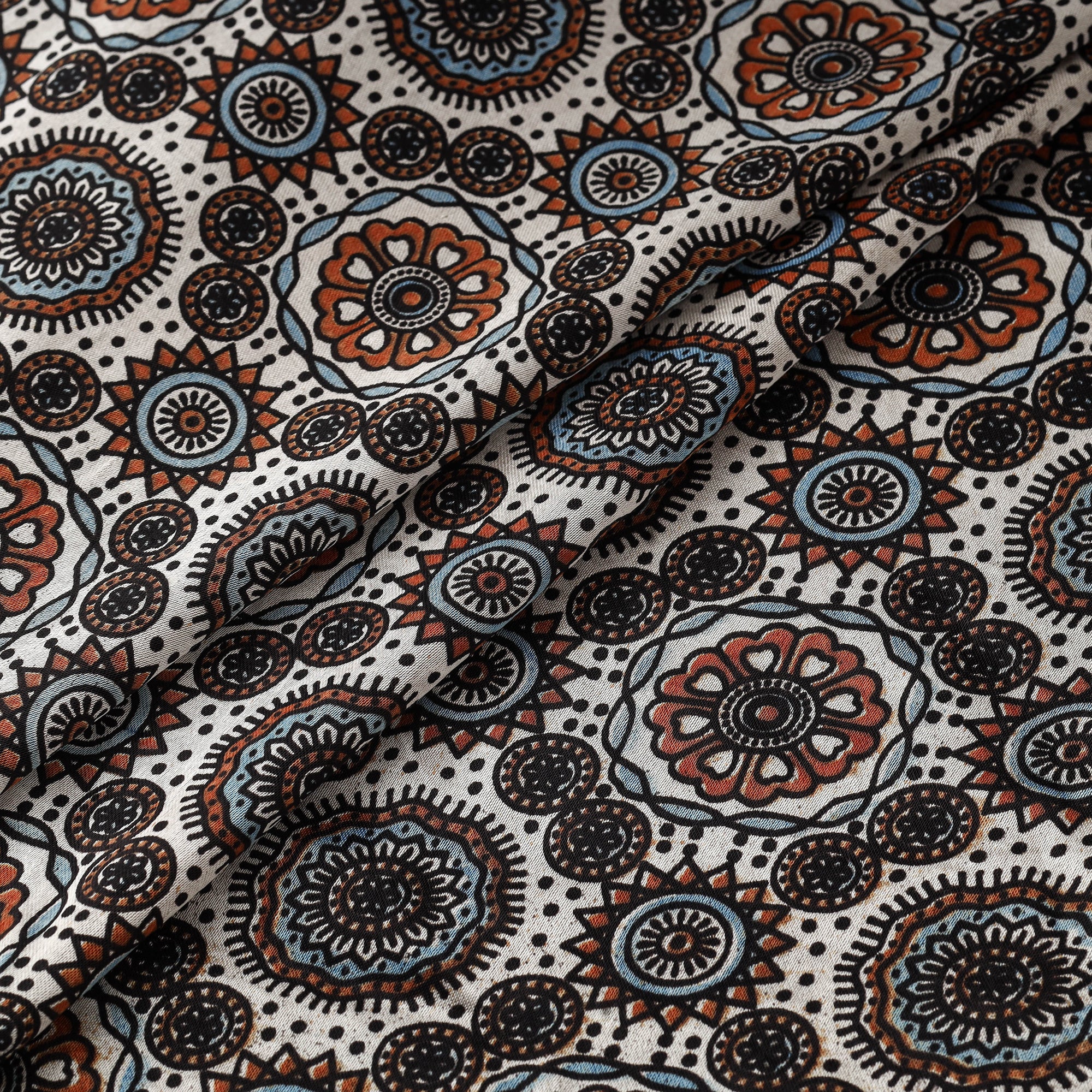 Ajrakh fabric crafted using natural-dyeing and resist block-printing techniques. This ancient craft is estimated to be around 4,500 years old. The Ajrakh artisans in India originally migrated from Sindh to the Kutch region of Gujarat and to Barmer in Rajasthan. Ajrakh is also the traditional attire of the Maldhari pastoral community of Bhuj. The process is long and detailed, involving multiple stages where each layer of colour is printed only after a resting period, allowing the cloth to absorb the dye fully. Made of mashru silk, which blends the richness of silk with the comfort of cotton, it is ideal for creating kurtas, shirts, dresses or even home decor items.