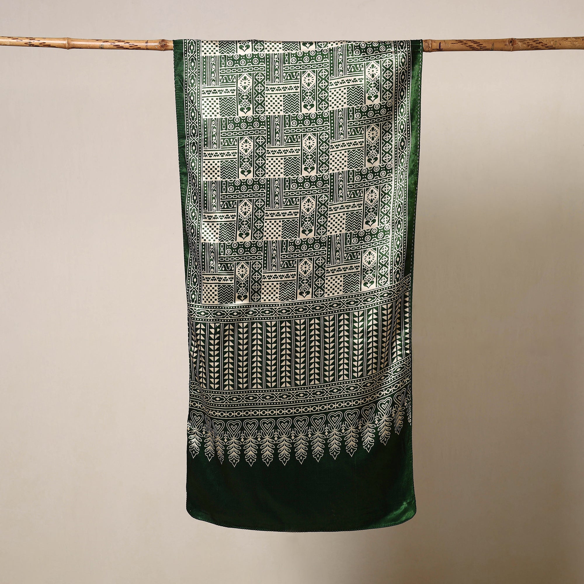 This green mashru silk ajrakh stole is made by skilled artisans from Kutch, Gujarat. It beautifully blends the sheen of silk with the comfort of cotton, while its intricate ajrakh print patterns add a touch of elegance. A versatile accessory, perfect for daily wear, office outfits, casual brunches, or even travel styling.
