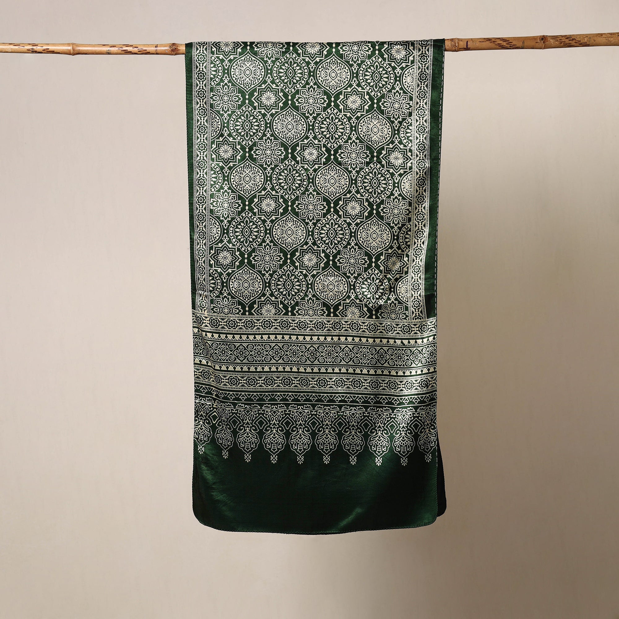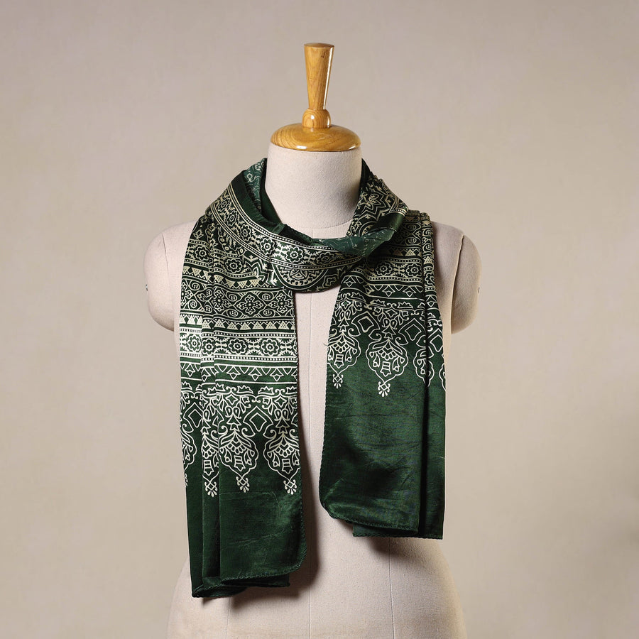This green mashru silk ajrakh stole is made by skilled artisans from Kutch, Gujarat. It beautifully blends the sheen of silk with the comfort of cotton, while its intricate ajrakh print patterns add a touch of elegance. A versatile accessory, perfect for daily wear, office outfits, casual brunches, or even travel styling.