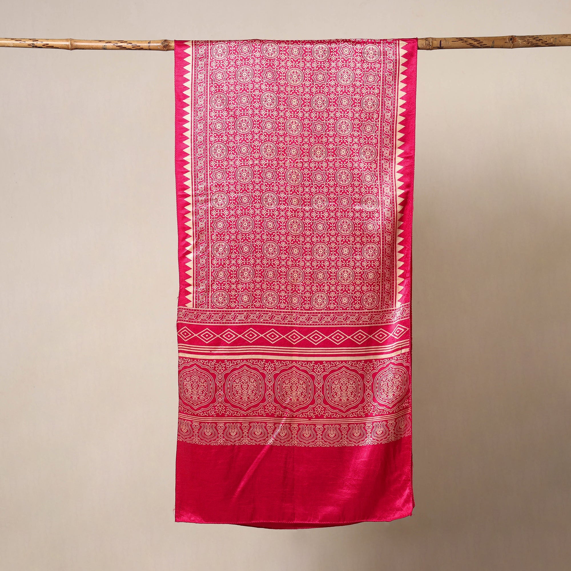 This pink mashru silk ajrakh stole is made by skilled artisans from Kutch, Gujarat. It beautifully blends the sheen of silk with the comfort of cotton, while its intricate ajrakh print patterns add a touch of elegance. A versatile accessory, perfect for daily wear, office outfits, casual brunches, or even travel styling.