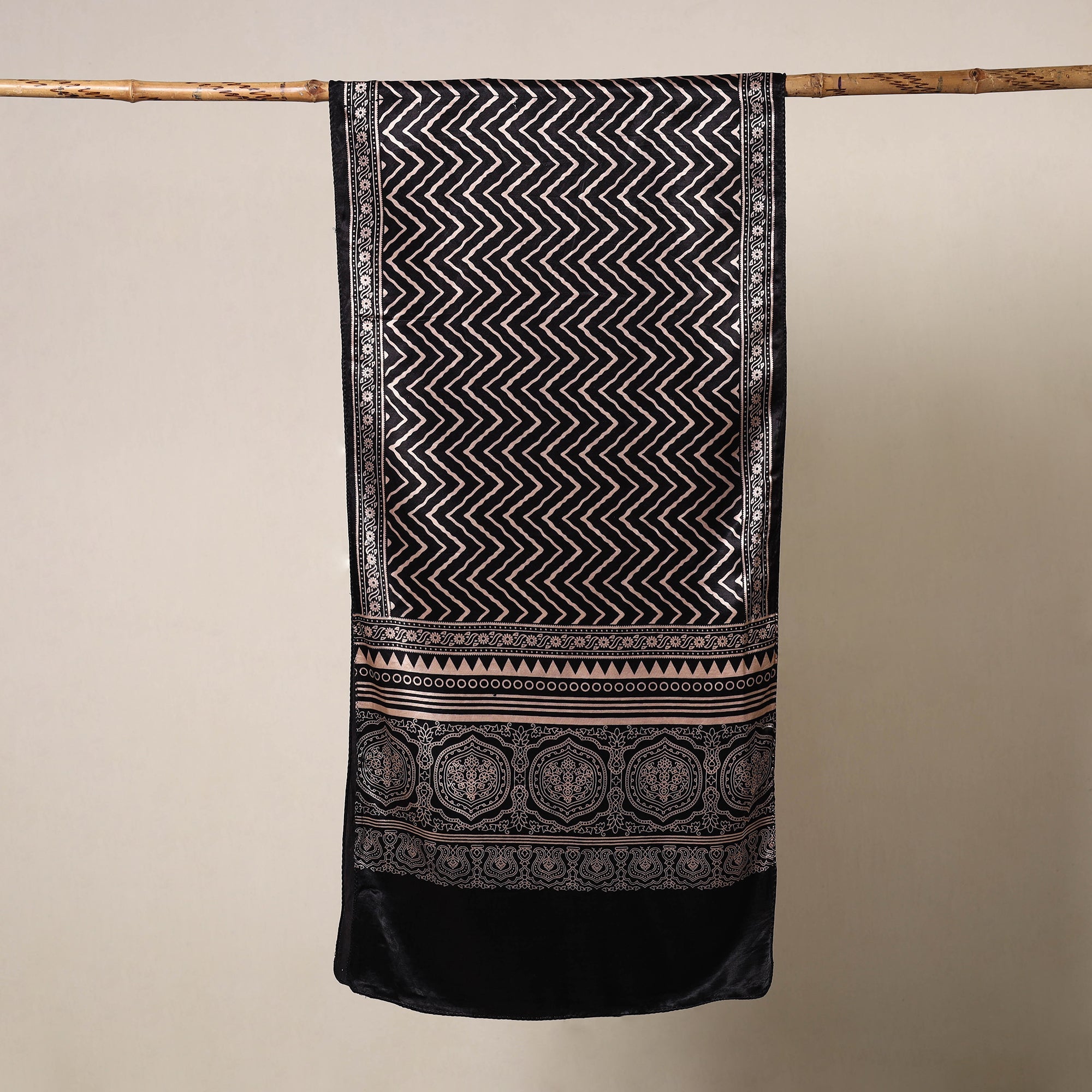This black mashru silk ajrakh stole is made by skilled artisans from Kutch, Gujarat. It beautifully blends the sheen of silk with the comfort of cotton, while its intricate ajrakh print patterns add a touch of elegance. A versatile accessory, perfect for daily wear, office outfits, casual brunches, or even travel styling.