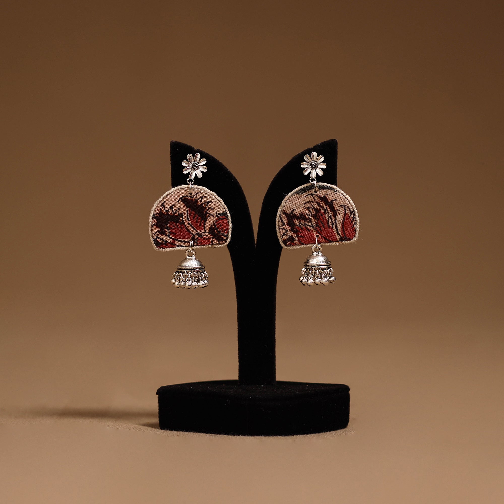Handmade fabric earrings with german silver jhumki is attached at the end, that enhances its charm. Perfect for everyday wear or special occasions, these earrings blend traditional style with a graceful touch.