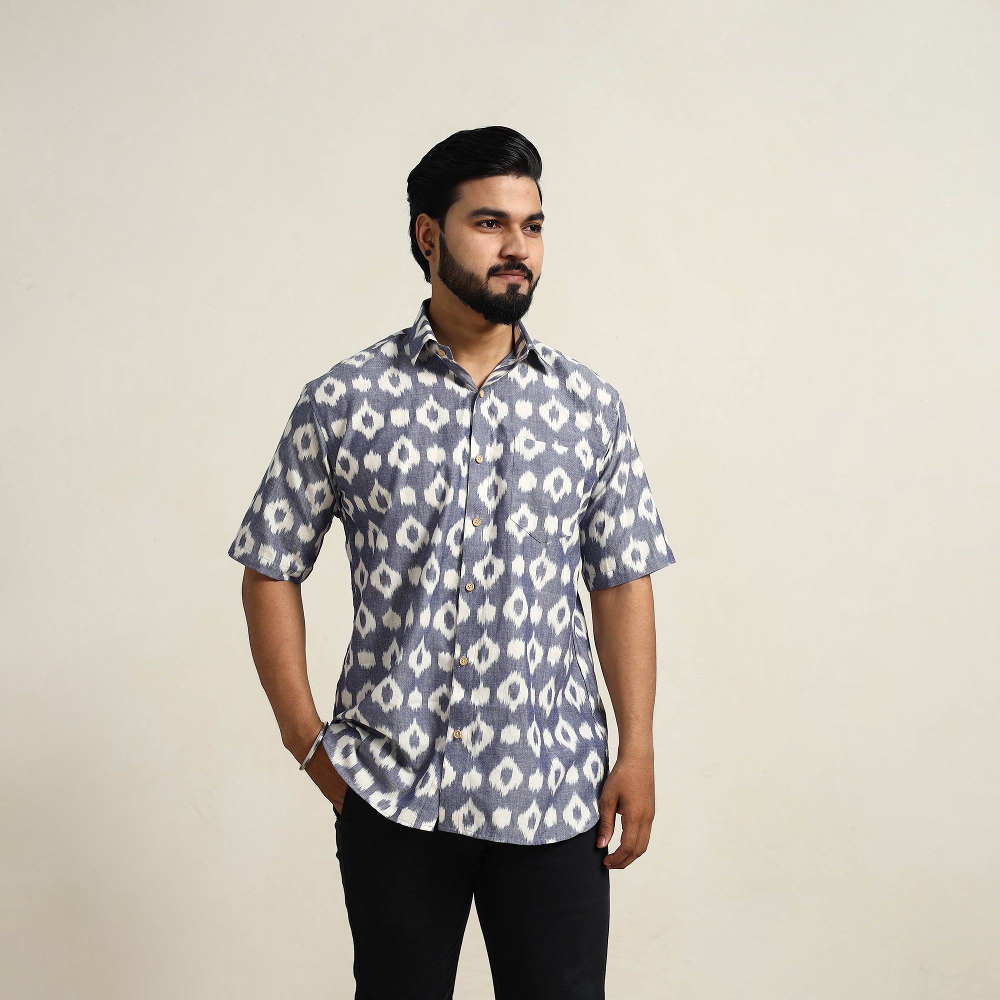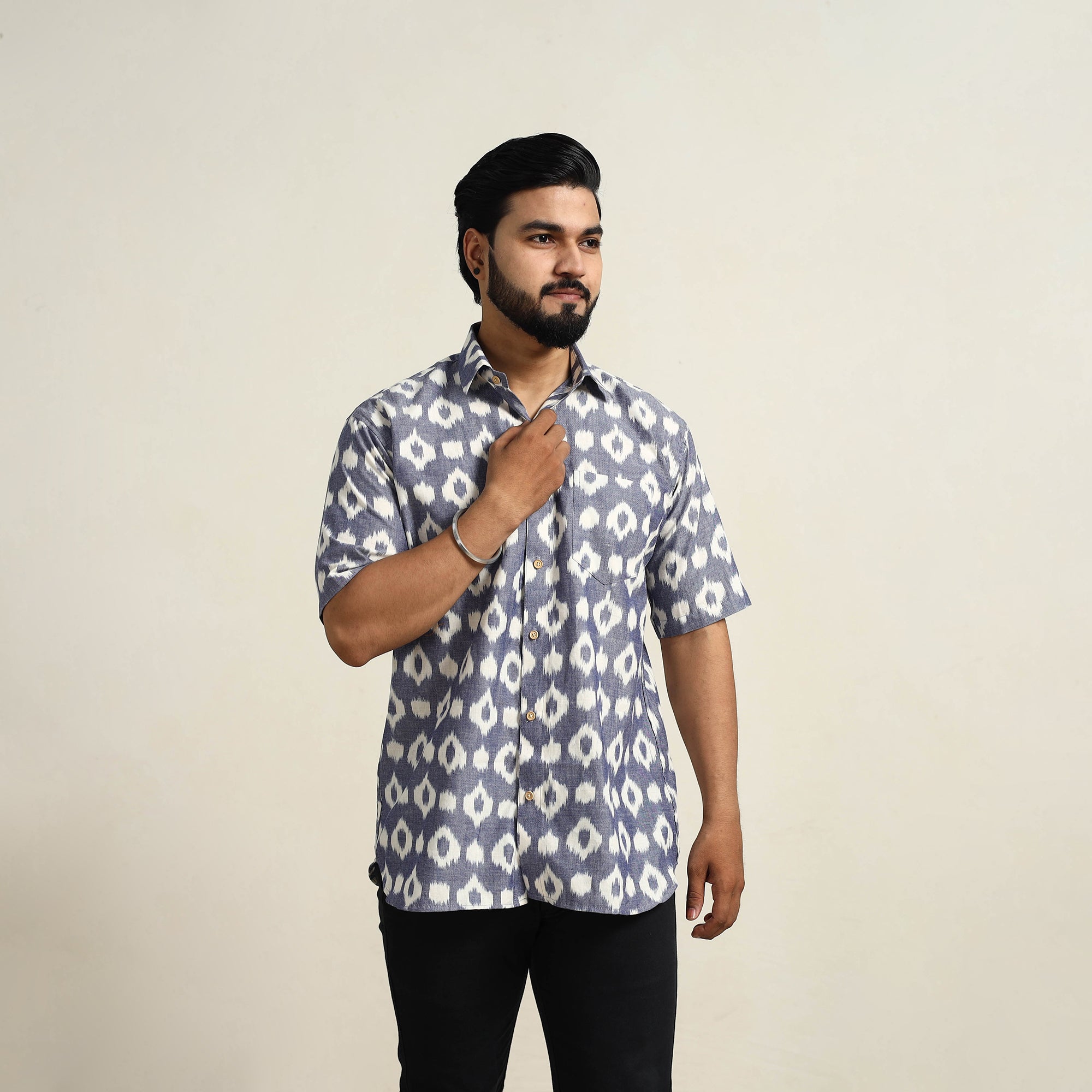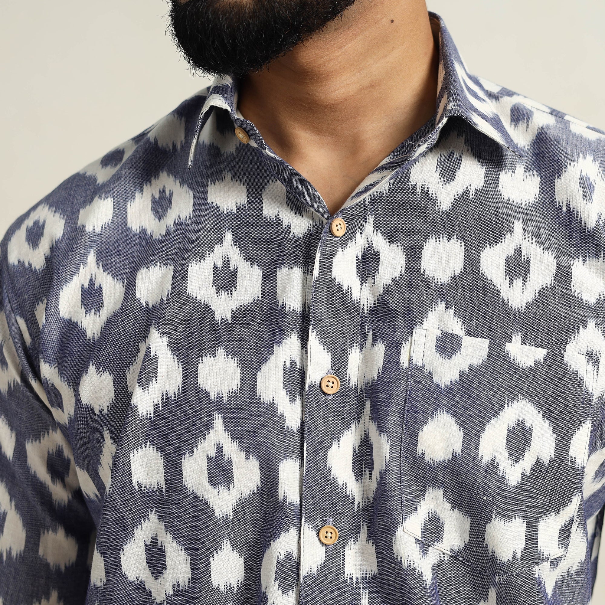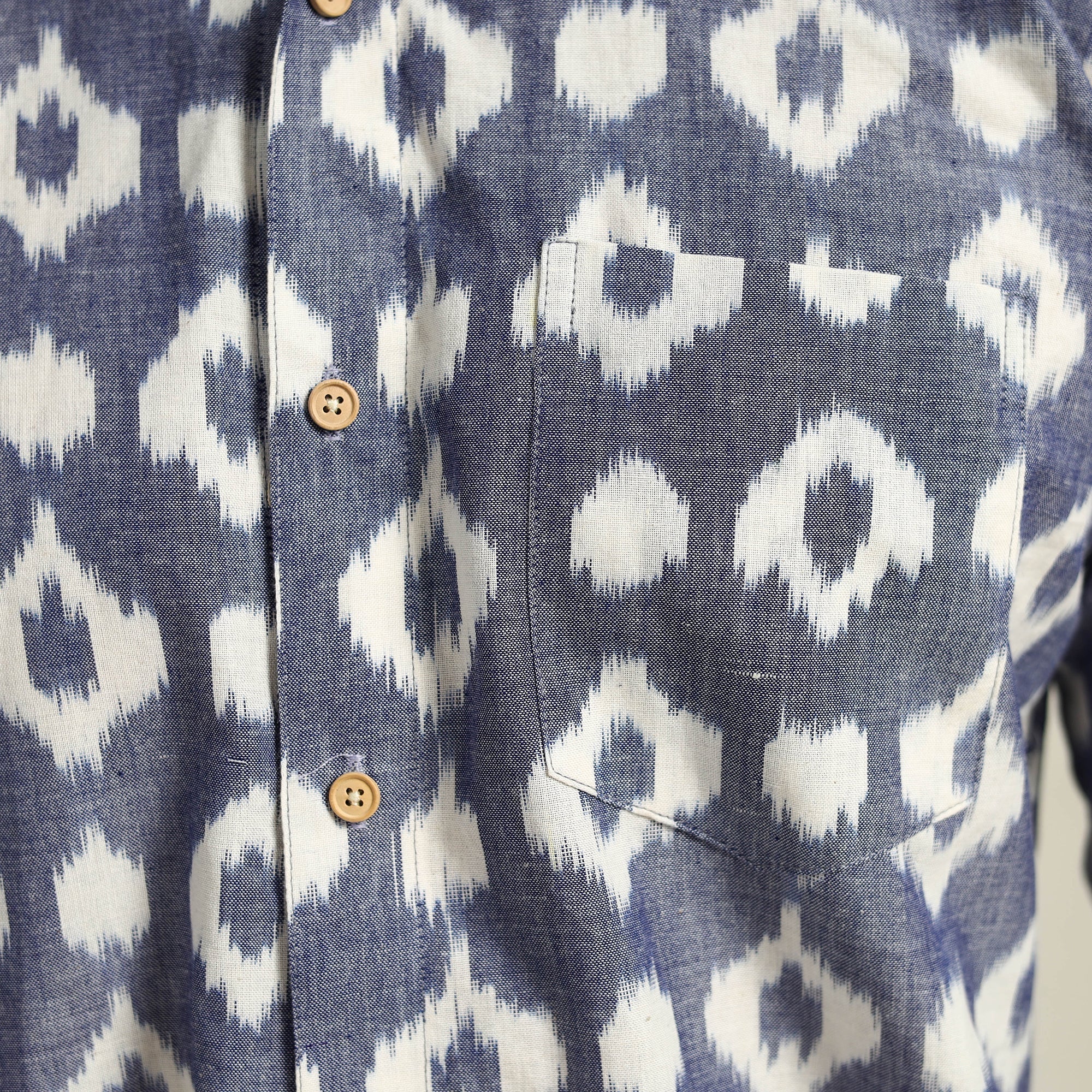 Experience the timeless elegance of our men cotton central asian blue pochampally ikat shirt. This shirt showcases the intricate Ikat dyeing technique, resulting in unique, vibrant patterns. Made from cotton, it ensures all-day comfort. The addition of crisp wooden buttons, half-sleeves and a practical patch pocket adds both style and functionality.