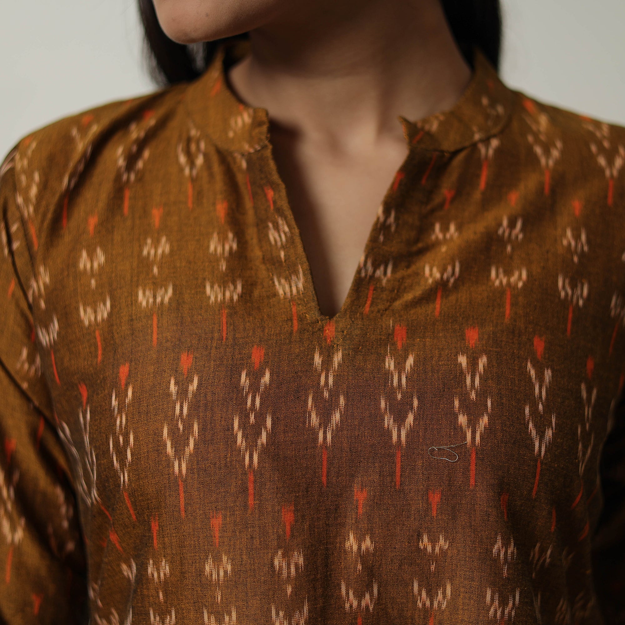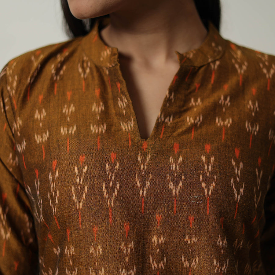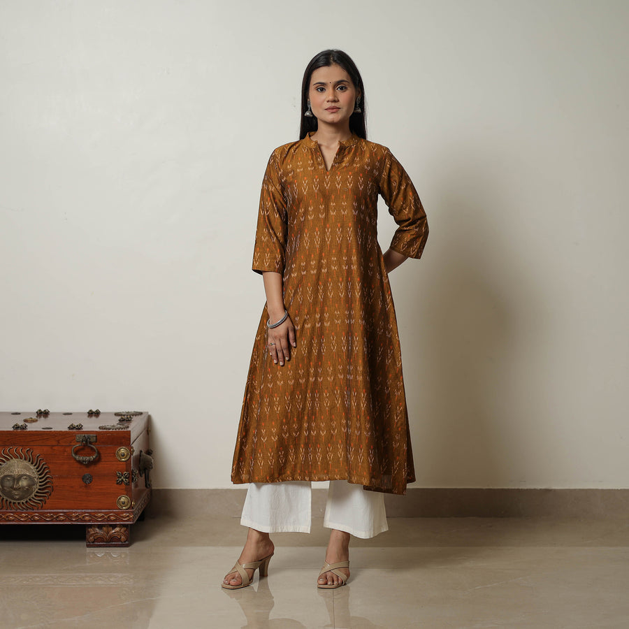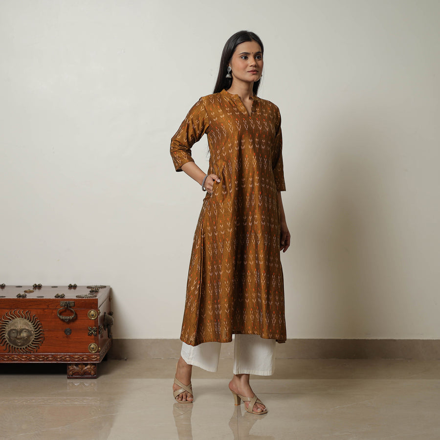 Embrace tradition with our brown mercerised cotton a-line pochampally ikat kurta. Handwoven with care, it showcases the vibrant, timeless beauty of Pochampally's ikat weaving. With a comfortable fit and handy side pocket, this kurta ensures style and ease for your everyday wear.