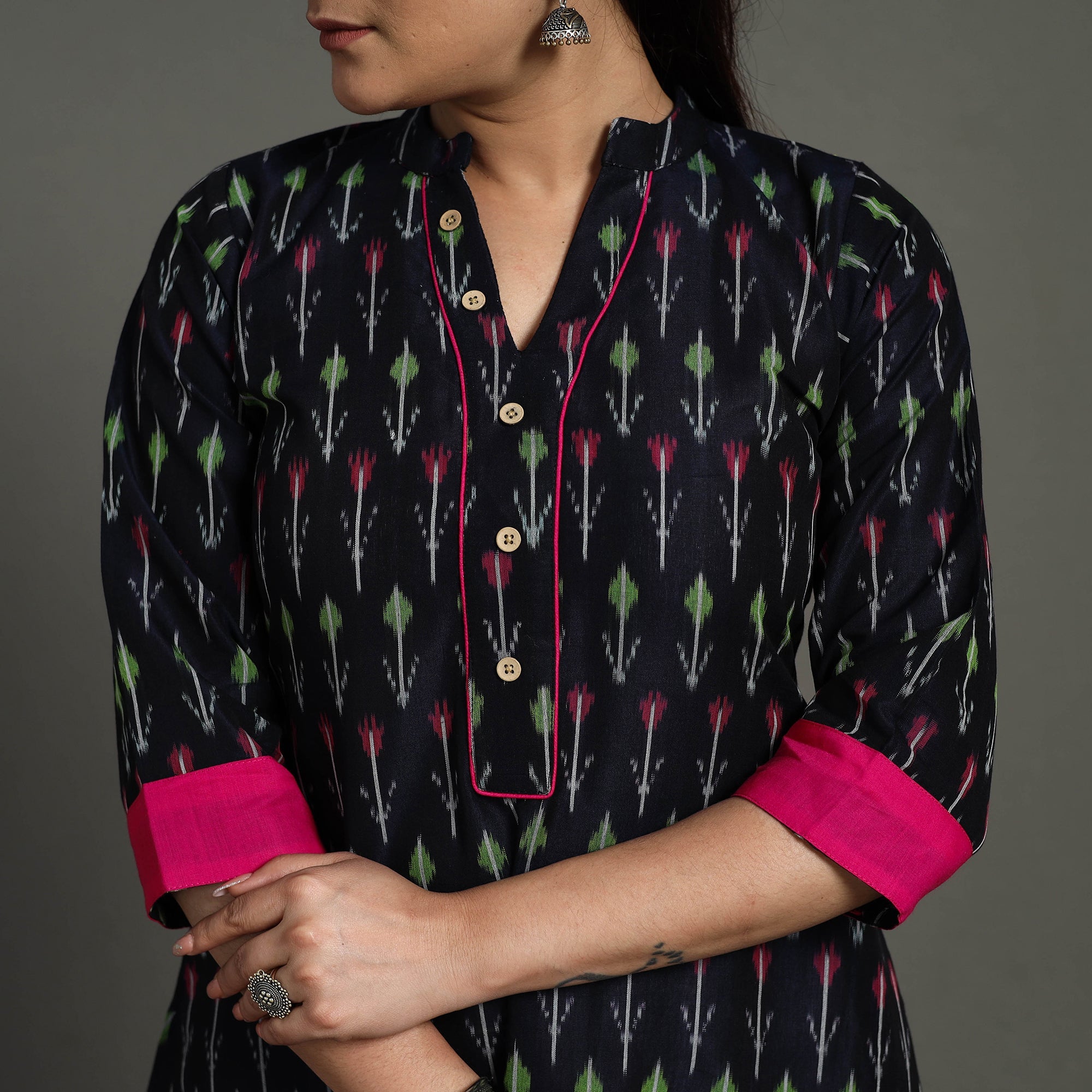 Experience the beauty of Indian ikat with our a-line blue pochampally ikat kurta. Crafted from breathable mercerised cotton, it showcases vibrant patterns created using traditional ikat techniques. Perfect for casual outings and festive occasions, this kurta features a stylish side pocket, adding both convenience and elegance to your look.
