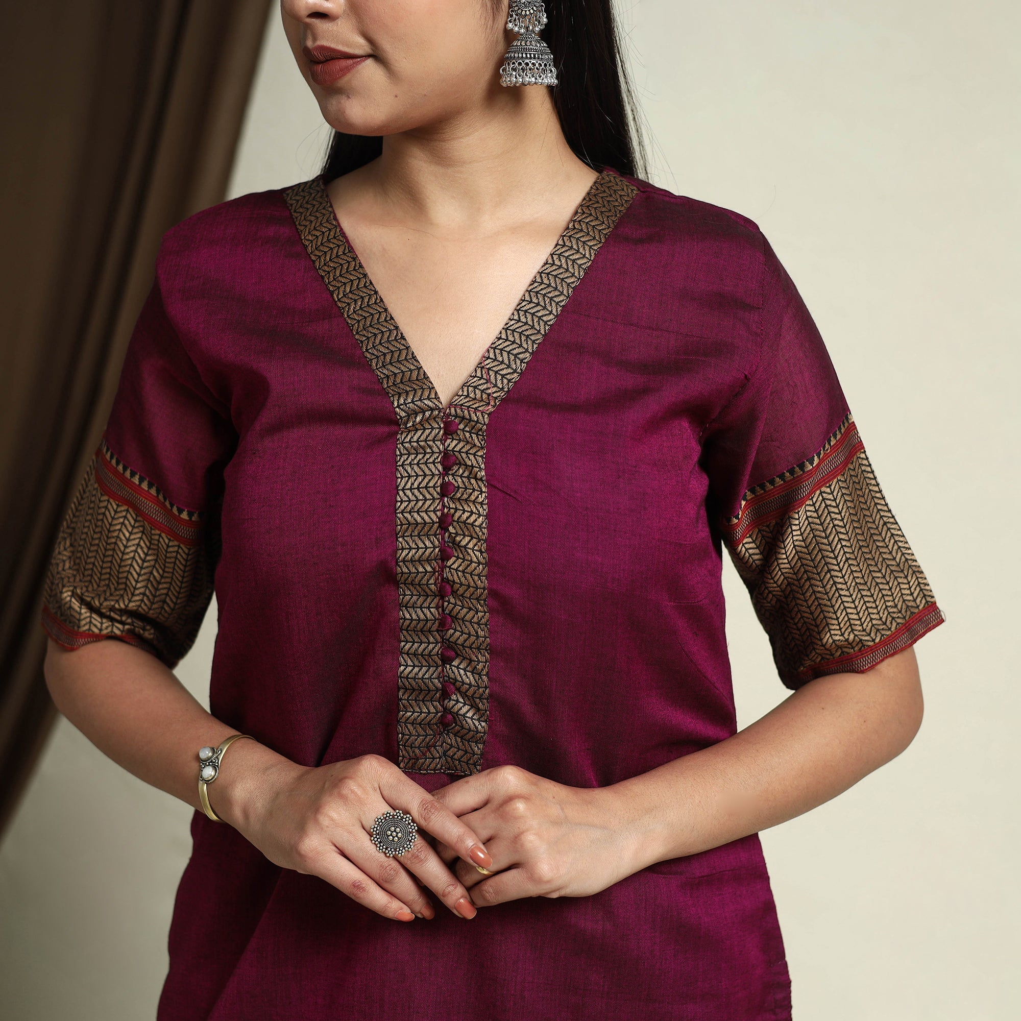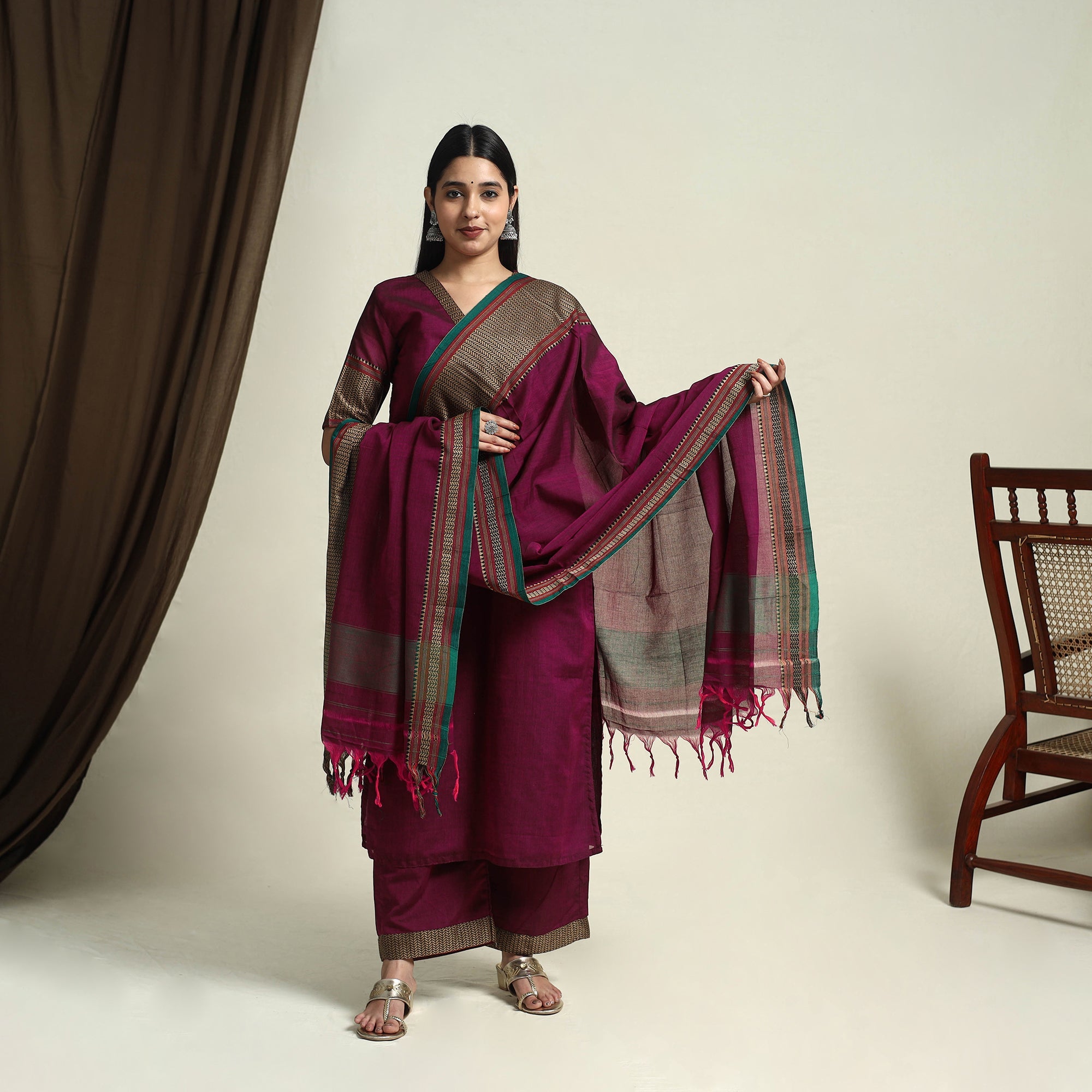 Elevate your ethnic wardrobe with this maroon dharwad kurta set, featuring a mercerised cotton kurta with a side pocket, elasticated palazzo with two pockets, and a matching dupatta. All three pieces are adorned with beautifully detailed thread borders. Rooted in Karnataka’s traditional dharwad weaving heritage, this ensemble blends artisanal charm with everyday comfort perfect for festive gatherings or casual elegance.