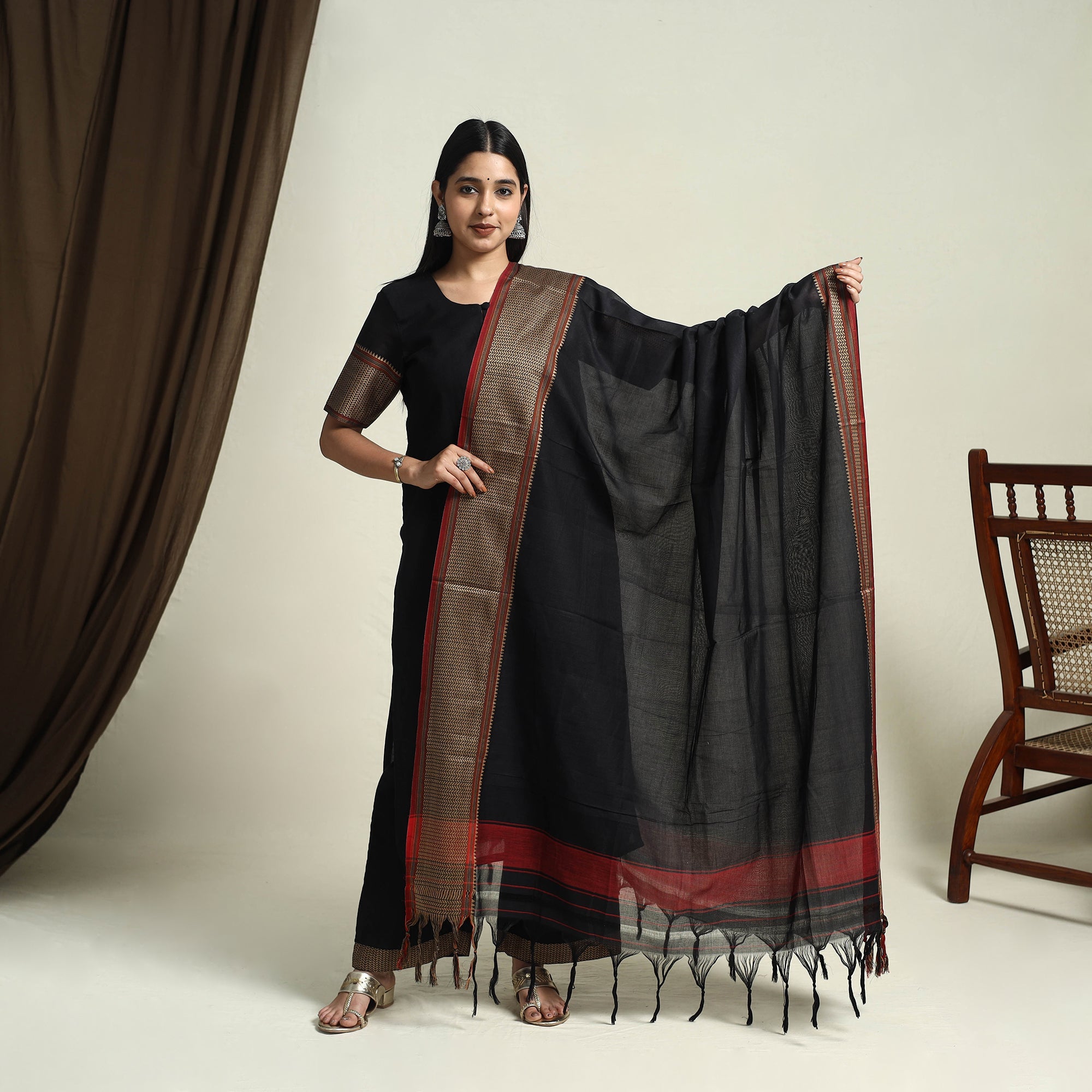 Elevate your ethnic wardrobe with this black dharwad kurta set, featuring a mercerised cotton kurta with a side pocket, elasticated palazzo with two pockets, and a matching dupatta. All three pieces are adorned with beautifully detailed thread borders. Rooted in Karnataka’s traditional dharwad weaving heritage, this ensemble blends artisanal charm with everyday comfort perfect for festive gatherings or casual elegance.