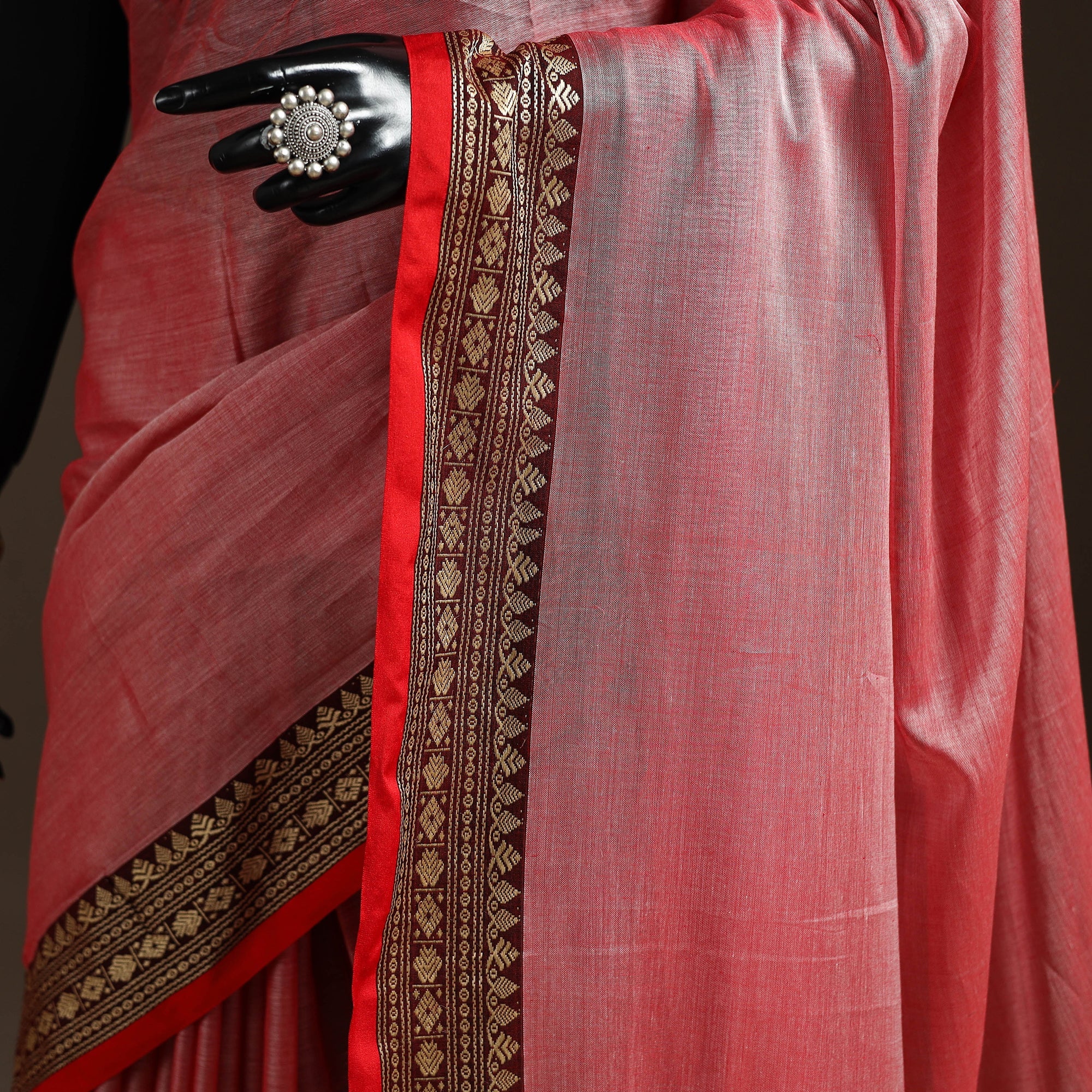 Mercerised cotton dharwad saree from Karnataka is woven using a traditional method known for its texture and intricate thread border work. The border features fine motifs and patterns that reflect the region’s style. These simple yet graceful details make the saree perfect for both formal occasions and festive celebrations.