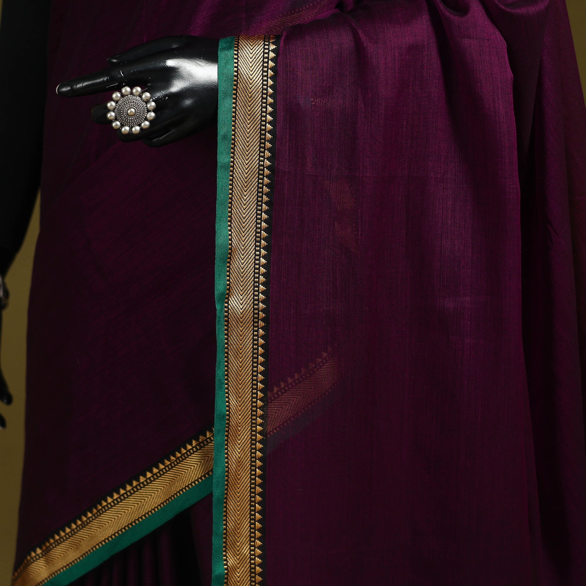 Purple mercerised cotton dharwad saree from Karnataka is woven using a traditional method known for its texture and intricate thread border work. The border features fine motifs and patterns that reflect the region’s style. These simple yet graceful details make the saree perfect for both formal occasions and everyday wear.