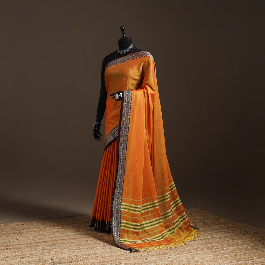 Mercerised cotton dharwad saree from Karnataka is woven using a traditional method known for its texture and intricate thread border work. The border features fine motifs and patterns that reflect the region’s style. These simple yet graceful details make the saree perfect for both formal occasions and festive celebrations.