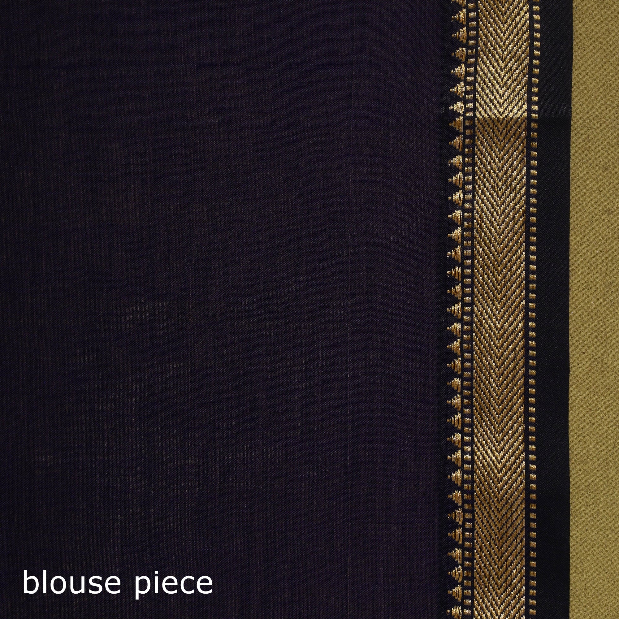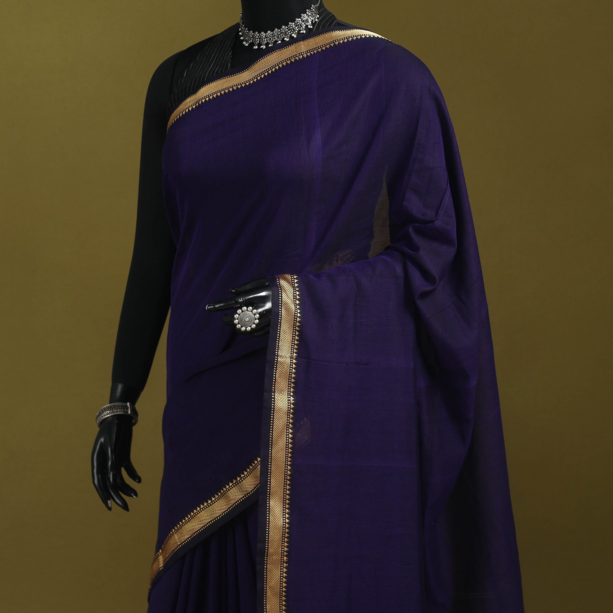 Purple mercerised cotton dharwad saree from Karnataka is woven using a traditional method known for its texture and intricate thread border work. The border features fine motifs and patterns that reflect the region’s style. These simple yet graceful details make the saree perfect for both formal occasions and everyday wear.