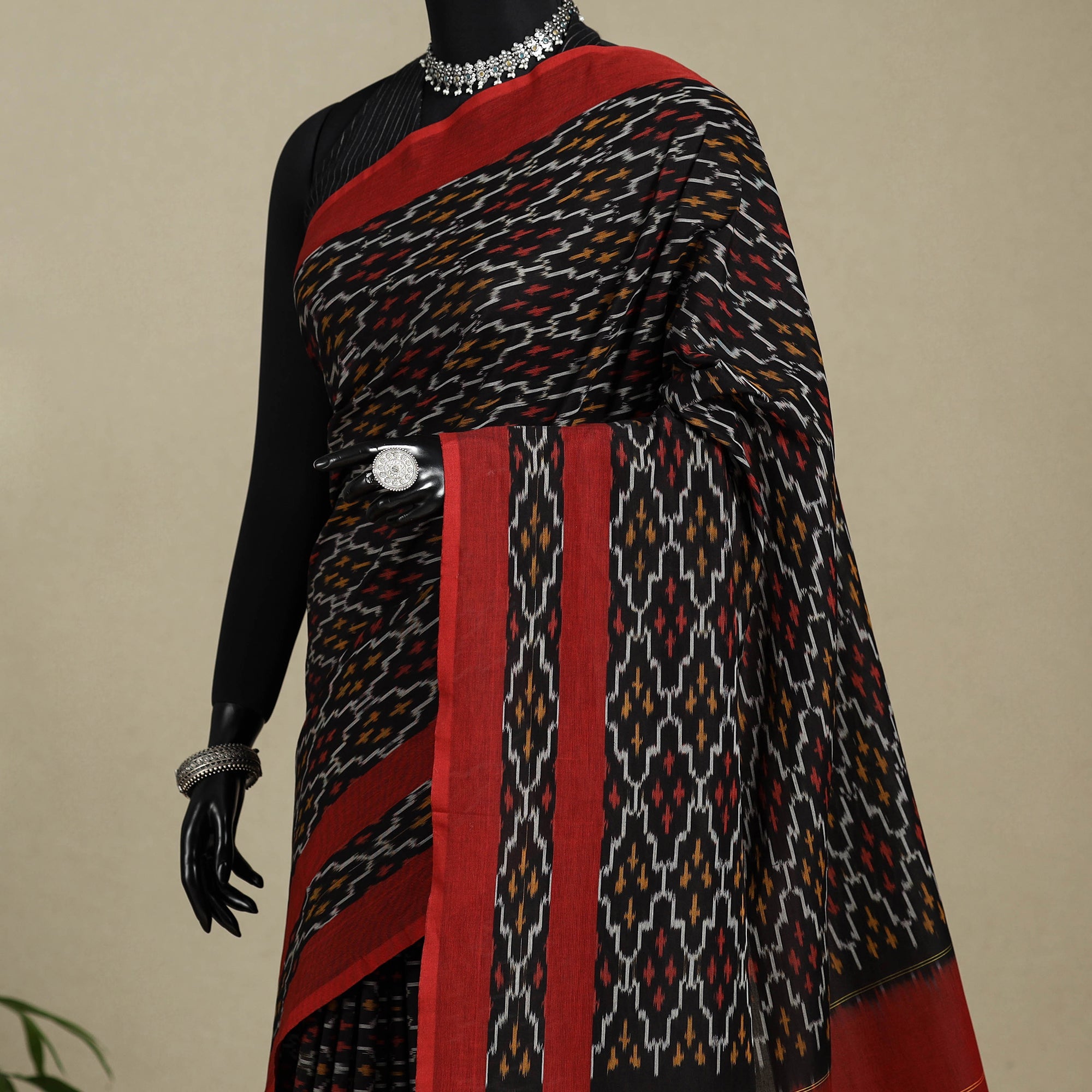 Immerse yourself in the timeless charm of this black pochampally Ikat saree, woven from mercerized cotton for a luxurious feel. The intricate Ikat patterns, achieved through the age-old resist-dyeing technique, reflect the heritage of Telangana’s skilled artisans. A statement piece that blends artistry and comfort, this saree is perfect for celebrations, cultural gatherings, or elevating your everyday style with effortless grace.