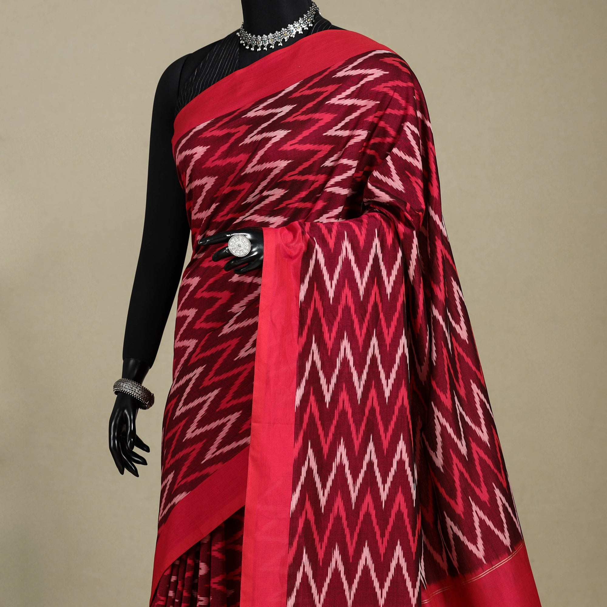 Immerse yourself in the timeless charm of this maroon pochampally Ikat saree, woven from mercerized cotton for a luxurious feel. The intricate Ikat patterns, achieved through the age-old resist-dyeing technique, reflect the heritage of Telangana’s skilled artisans. A statement piece that blends artistry and comfort, this saree is perfect for celebrations, cultural gatherings, or elevating your everyday style with effortless grace.