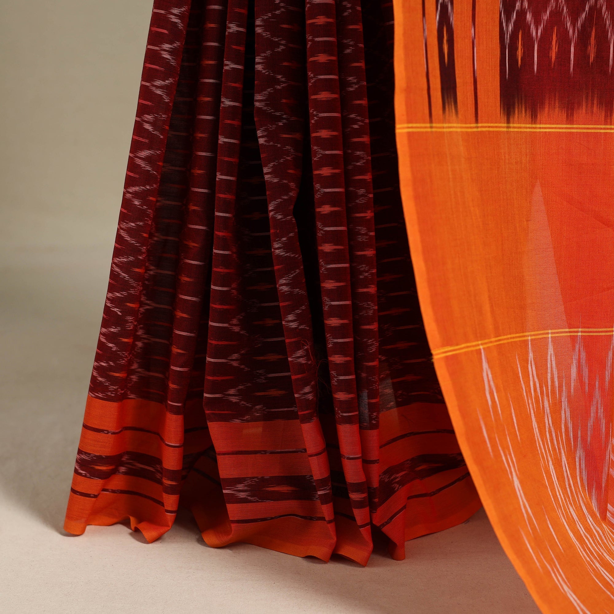 | Material | This maroon pochampally ikat saree is woven from mercerised cotton, offering a smooth and comfortable feel. The intricate ikat patterns, created through the age-old resist-dyeing technique, reflect the rich heritage of Telangana’s skilled artisans. A statement piece that blends artistry with comfort, this saree is perfect for celebrations, cultural gatherings, or elevating your everyday style with effortless grace. Note: This piece carries tiny knots, thread pulls, or uneven lines — not flaws, but fingerprints. Every irregularity is a whisper from the hands that made it. It’s what happens when tradition weaves through time, not machines. If you’re looking for perfection, this isn’t it. But if you’re looking for soul — you’ve found it. |