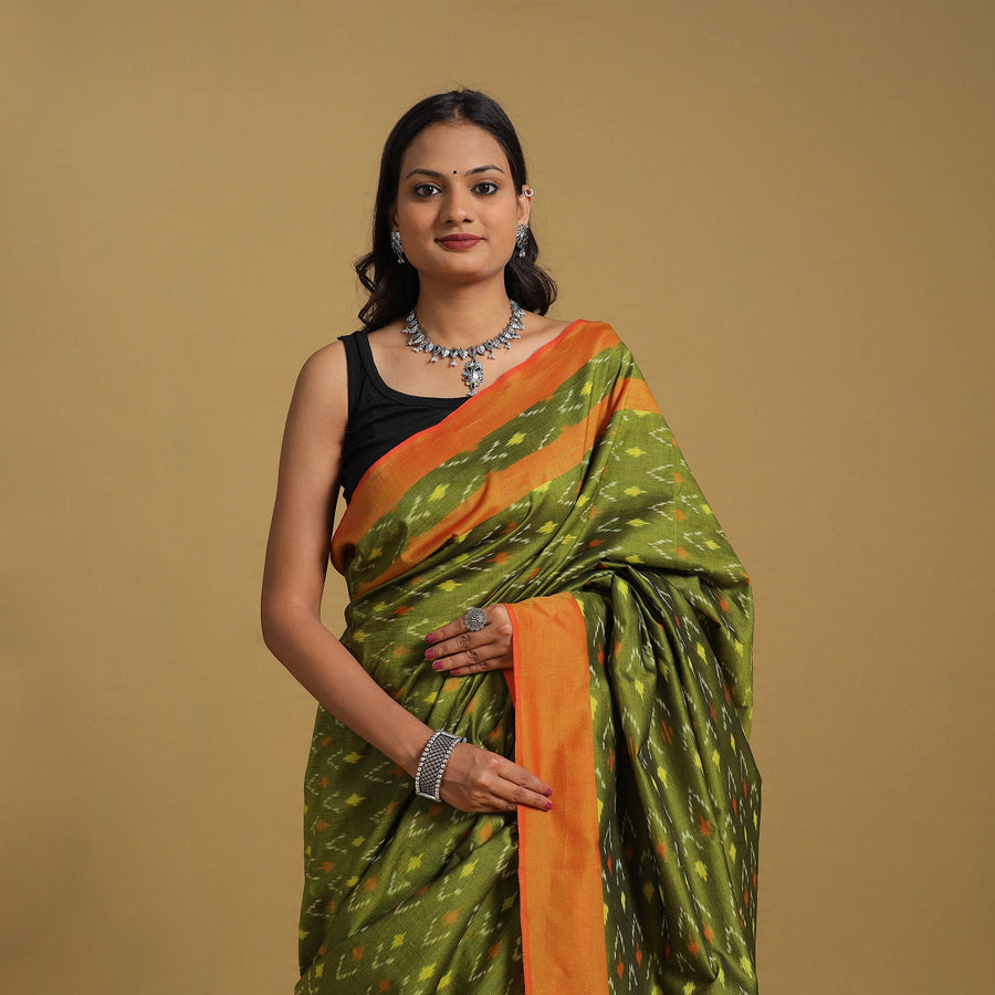 Immerse yourself in the timeless charm of this green pochampally Ikat saree, woven from mercerized cotton for a luxurious feel. The intricate Ikat patterns, achieved through the age-old resist-dyeing technique, reflect the heritage of Telangana’s skilled artisans. A statement piece that blends artistry and comfort, this saree is perfect for celebrations, cultural gatherings, or elevating your everyday style with effortless grace.