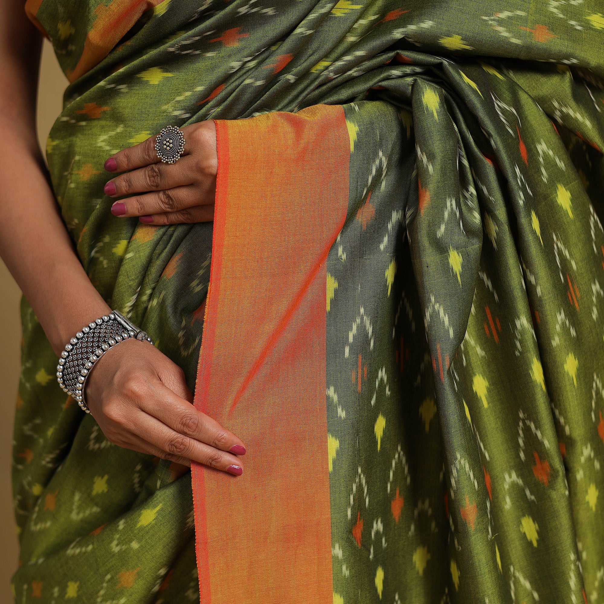 Green - Handloom Raw Silk Pochampally Ikat Fabric 01
