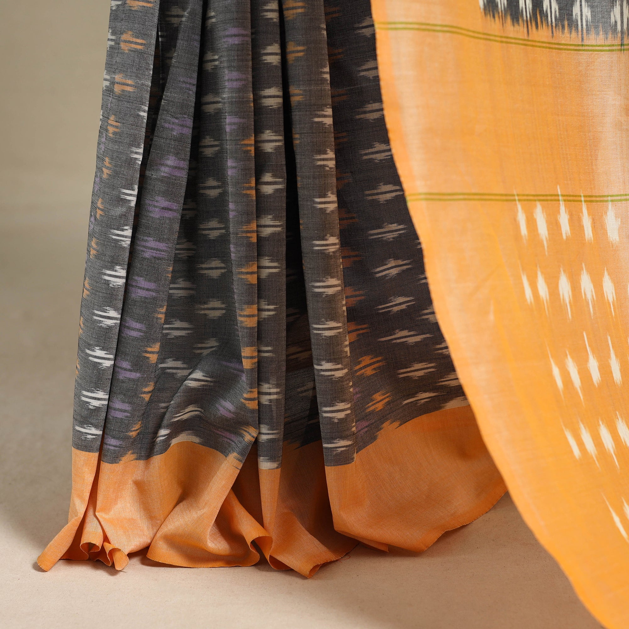 This grey pochampally ikat saree is woven from mercerised cotton, offering a smooth and comfortable feel. The intricate ikat patterns, created through the age-old resist-dyeing technique, reflect the rich heritage of Telangana’s skilled artisans. A statement piece that blends artistry with comfort, this saree is perfect for celebrations, cultural gatherings, or elevating your everyday style with effortless grace.