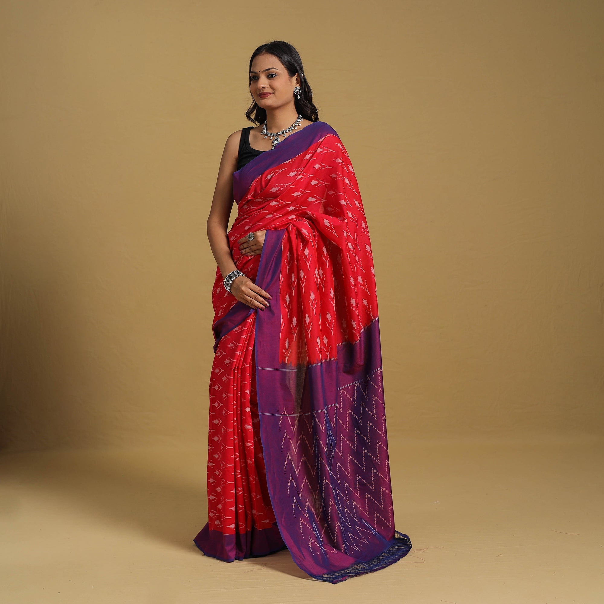 Immerse yourself in the timeless charm of this red pochampally Ikat saree, woven from mercerized cotton for a luxurious feel. The intricate Ikat patterns, achieved through the age-old resist-dyeing technique, reflect the heritage of Telangana’s skilled artisans. A statement piece that blends artistry and comfort, this saree is perfect for celebrations, cultural gatherings, or elevating your everyday style with effortless grace.