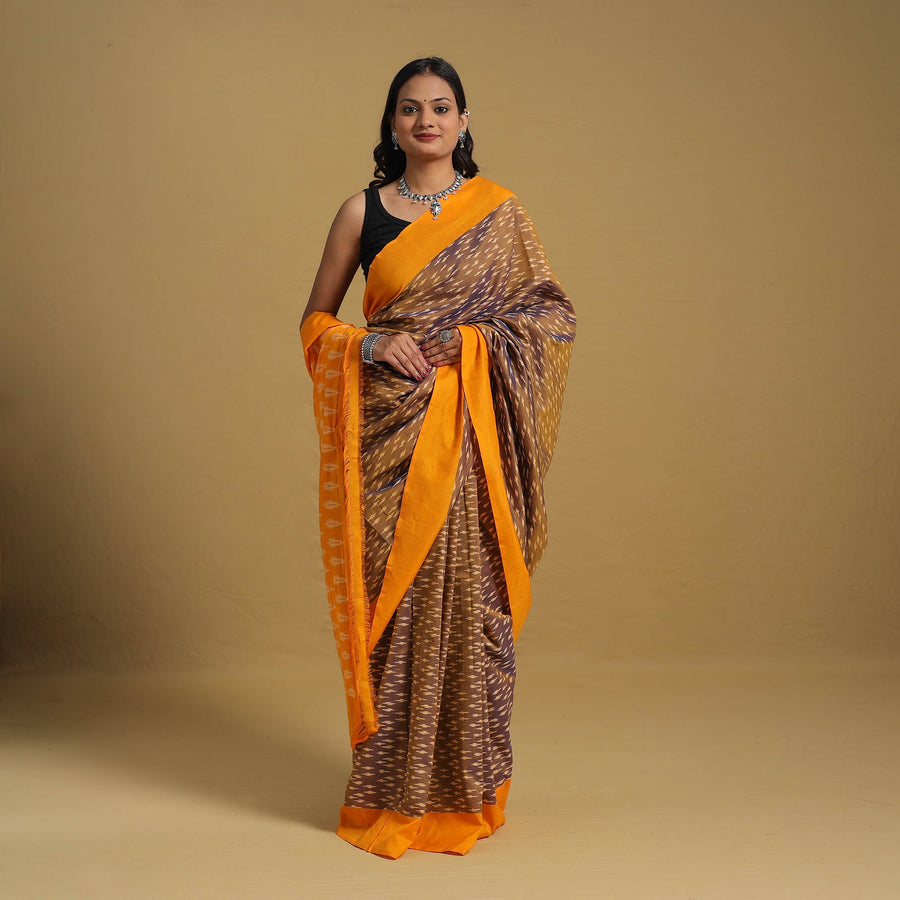 Immerse yourself in the timeless charm of this brown pochampally Ikat saree, woven from mercerized cotton for a luxurious feel. The intricate Ikat patterns, achieved through the age-old resist-dyeing technique, reflect the heritage of Telangana’s skilled artisans. A statement piece that blends artistry and comfort, this saree is perfect for celebrations, cultural gatherings, or elevating your everyday style with effortless grace.