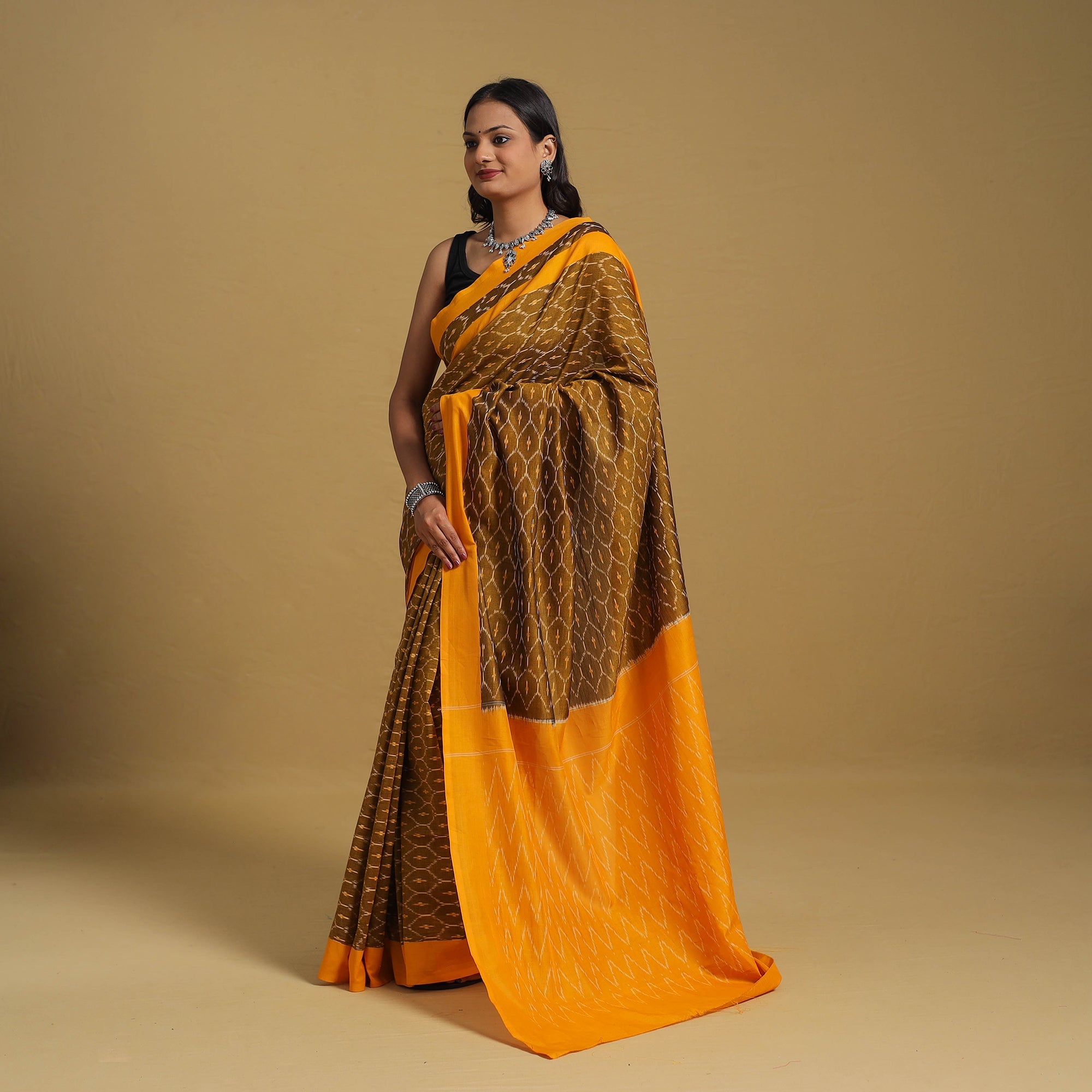 Immerse yourself in the timeless charm of this brown pochampally Ikat saree, woven from mercerized cotton for a luxurious feel. The intricate Ikat patterns, achieved through the age-old resist-dyeing technique, reflect the heritage of Telangana’s skilled artisans. A statement piece that blends artistry and comfort, this saree is perfect for celebrations, cultural gatherings, or elevating your everyday style with effortless grace.