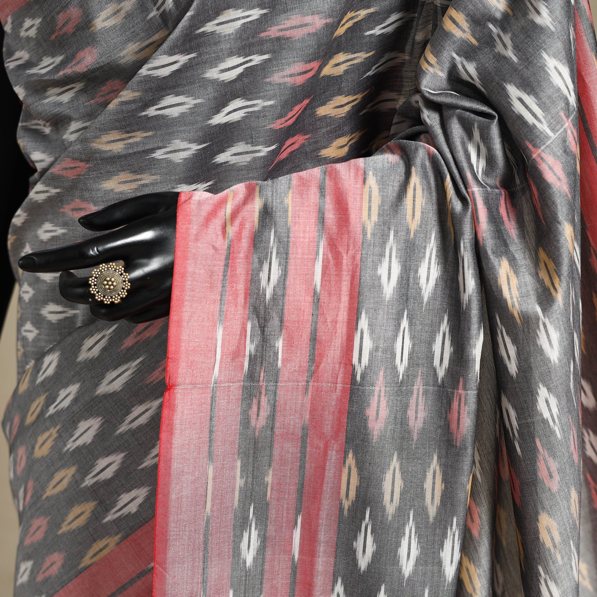 This grey pochampally ikat saree is woven from mercerised cotton, offering a smooth and comfortable feel. The intricate ikat patterns, created through the age-old resist-dyeing technique, reflect the rich heritage of Telangana’s skilled artisans. A statement piece that blends artistry with comfort, this saree is perfect for celebrations, cultural gatherings, or elevating your everyday style with effortless grace.