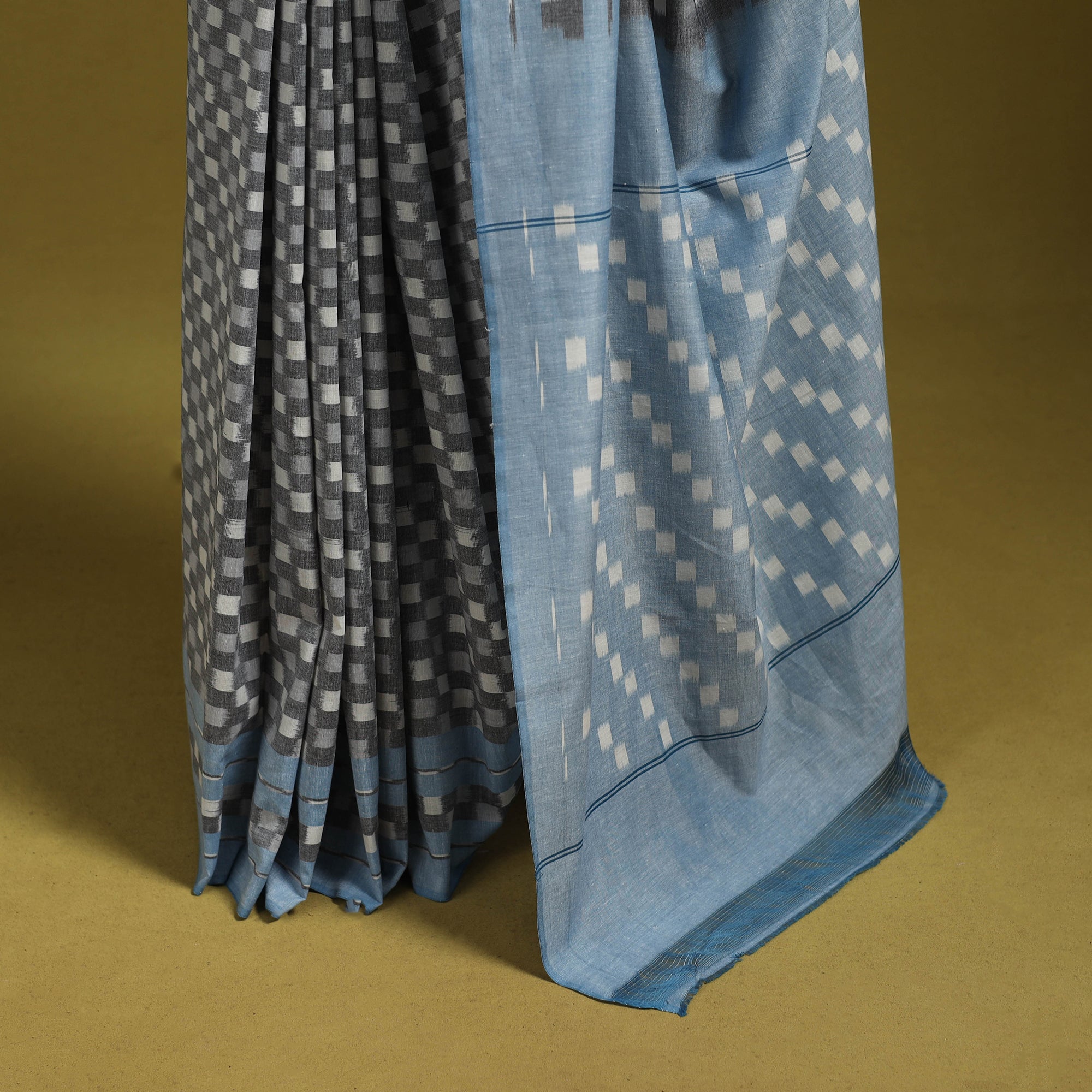 Grey handloom pochampally ikat saree, woven from mercerized cotton. The intricate Ikat patterns, achieved through the age-old resist-dyeing technique, reflect the heritage of Telangana’s skilled artisans. A statement piece that blends artistry and comfort, this saree is perfect for celebrations, cultural gatherings, or elevating your everyday style with effortless grace.