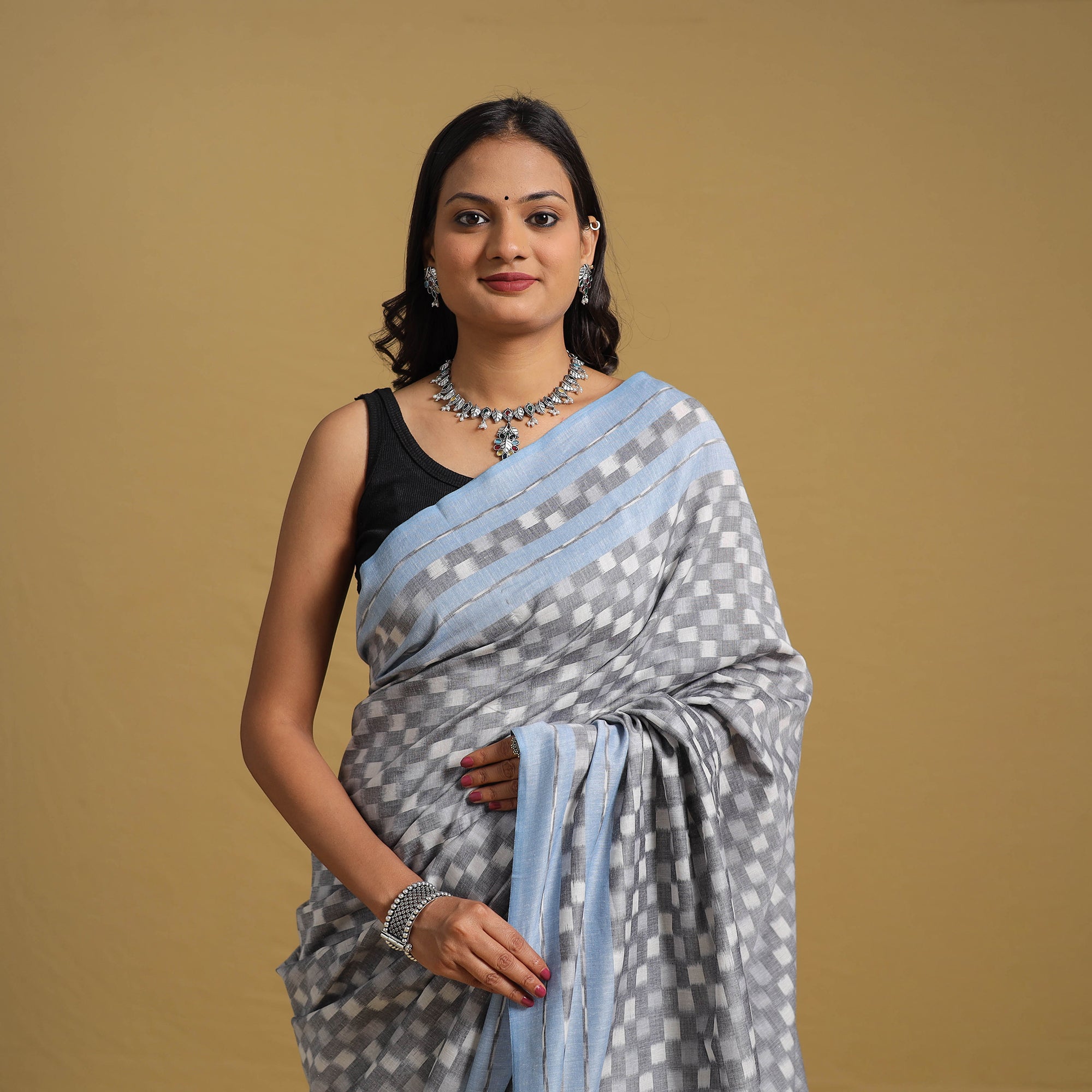 Immerse yourself in the timeless charm of this grey pochampally Ikat saree, woven from mercerized cotton for a luxurious feel. The intricate Ikat patterns, achieved through the age-old resist-dyeing technique, reflect the heritage of Telangana’s skilled artisans. A statement piece that blends artistry and comfort, this saree is perfect for celebrations, cultural gatherings, or elevating your everyday style with effortless grace.