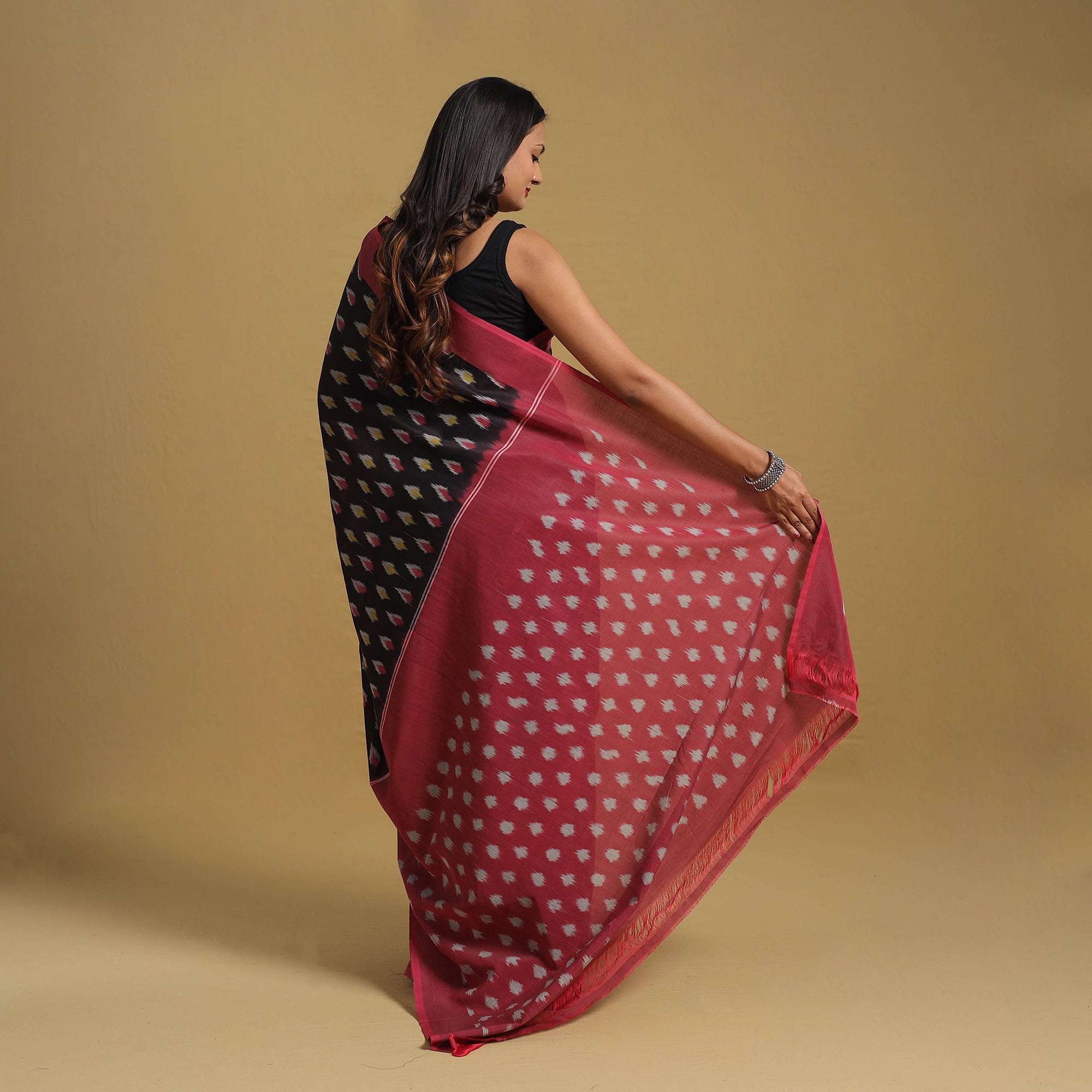 Immerse yourself in the timeless charm of this black pochampally Ikat saree, woven from mercerized cotton for a luxurious feel. The intricate Ikat patterns, achieved through the age-old resist-dyeing technique, reflect the heritage of Telangana’s skilled artisans. A statement piece that blends artistry and comfort, this saree is perfect for celebrations, cultural gatherings, or elevating your everyday style with effortless grace.