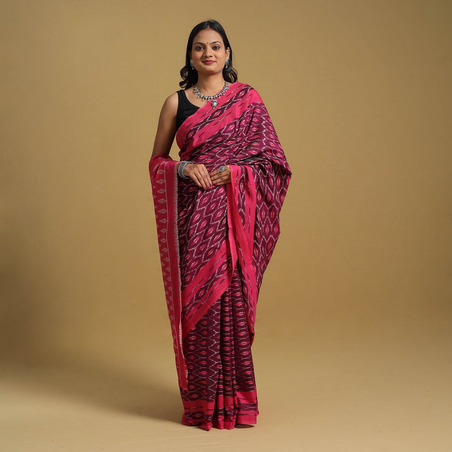 Immerse yourself in the timeless charm of this pochampally Ikat saree, woven from mercerized cotton for a luxurious feel. The intricate Ikat patterns, achieved through the age-old resist-dyeing technique, reflect the heritage of Telangana’s skilled artisans. A statement piece that blends artistry and comfort, this saree is perfect for celebrations, cultural gatherings, or elevating your everyday style with effortless grace.