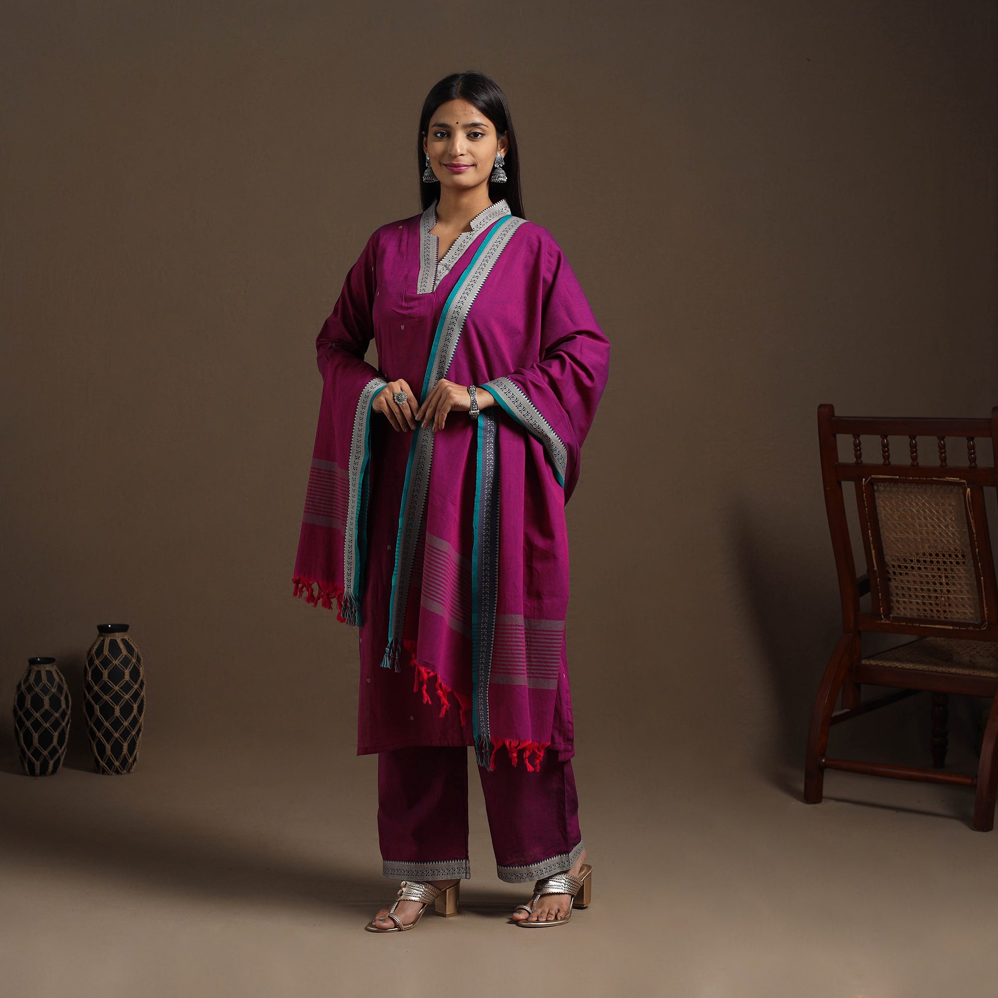 Elevate your wardrobe with this beautifully designed pink jacquard kurta set. Made from soft mercerised cotton featuring intricate woven patterns, the straight-fit kurta includes a convenient side pocket. It is paired with a matching palazzo that offers an elasticated waistband and two practical side pockets for added comfort. The look is completed with a graceful dupatta, making it ideal for festive gatherings or everyday wear.