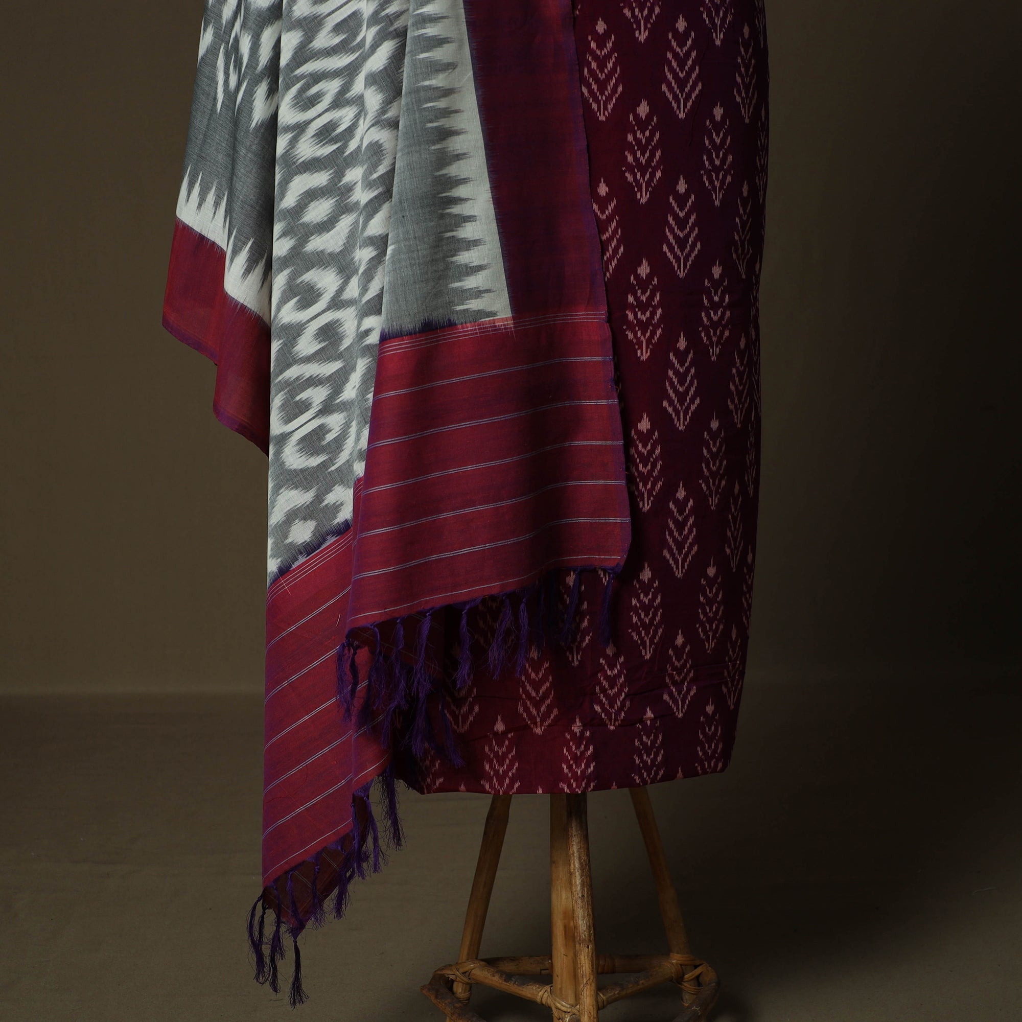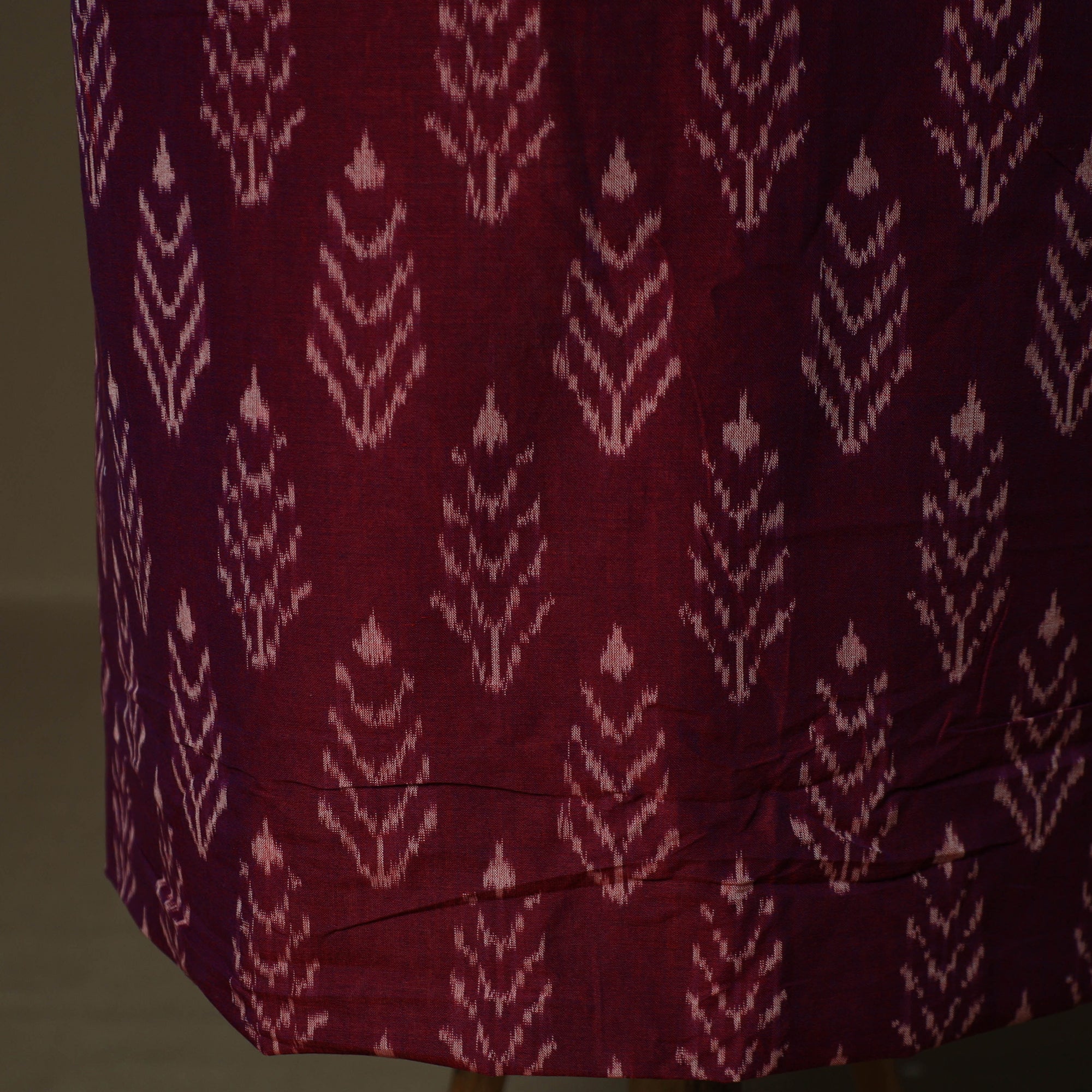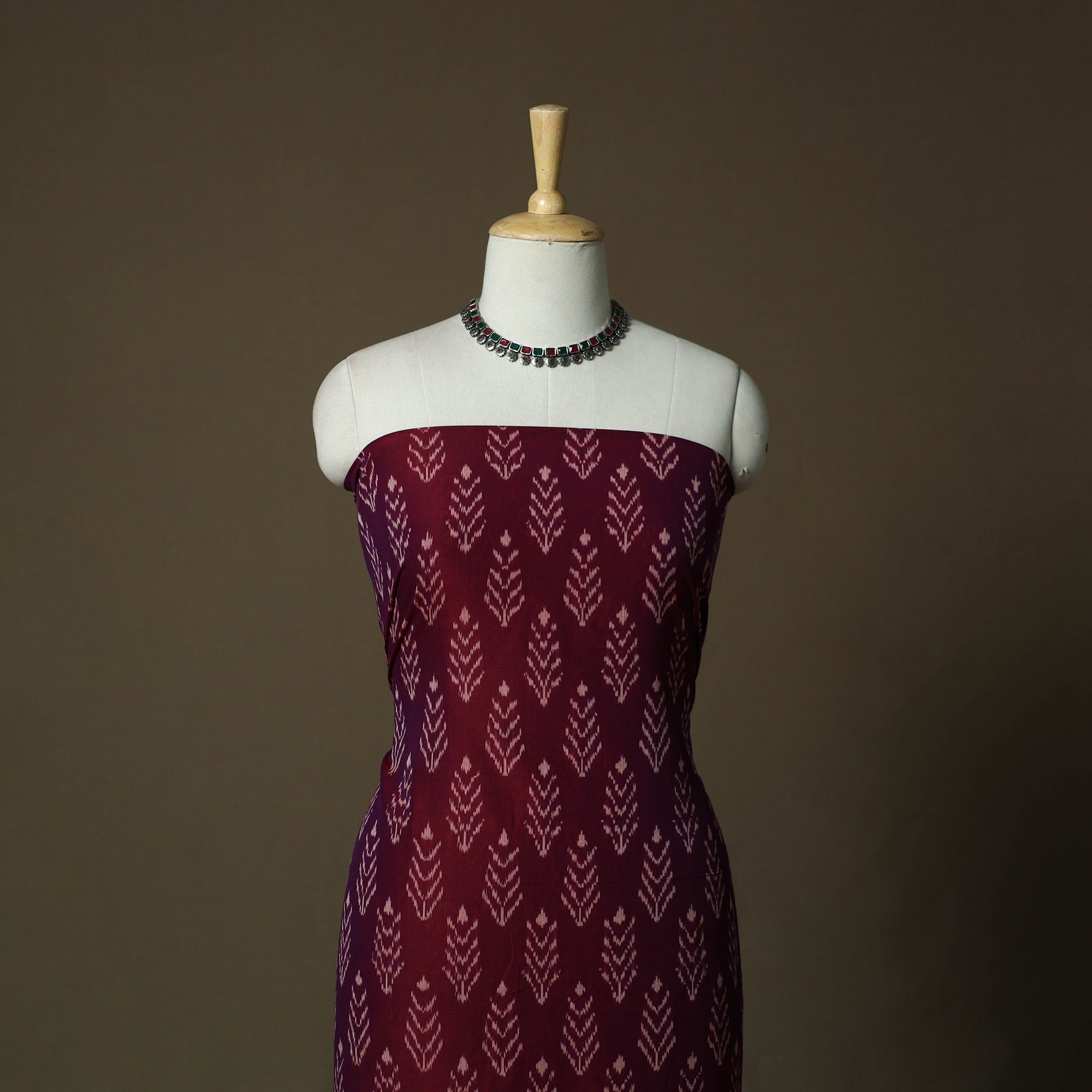 Pochampally ikat mercerised cotton 2pc unstitched dress material is woven by skilled weavers from Telangana using a resist-dye technique that is thousands of years old. Each thread is dyed before weaving to create the signature intricate Ikat patterns, the set includes kurta fabric with a matching dupatta, offering a graceful drape and making it ideal for tailoring elegant ethnic wear.