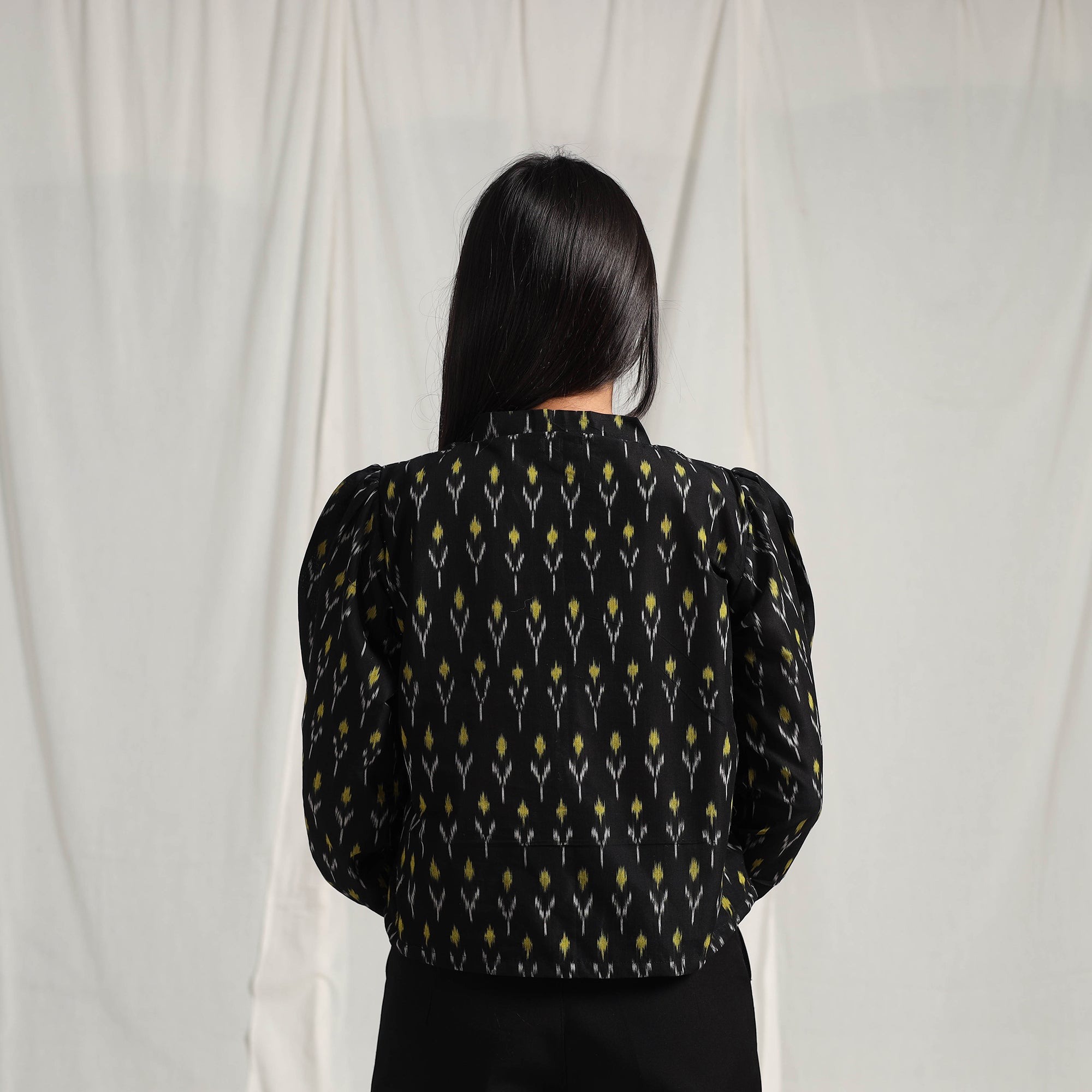 Add effortless charm to your wardrobe with this black pochampally Ikat crop top. Made from mercerized cotton, it is comfortable, breathable, and perfect for all-day wear. The full sleeve design offers a trendy, versatile look, ideal for casual outings, festive events, or relaxed evenings.