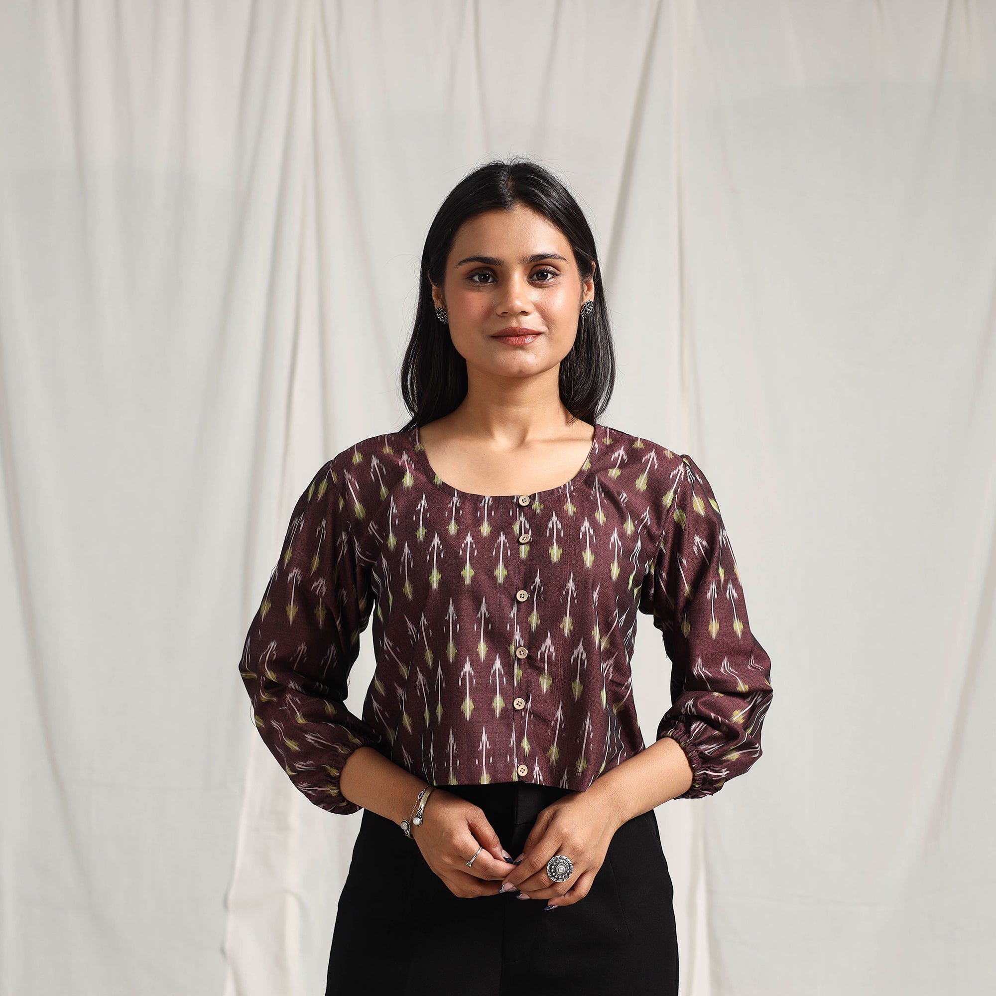Add effortless charm to your wardrobe with this brown pochampally Ikat crop top. Made from mercerized cotton, it is comfortable, breathable, and perfect for all-day wear. The full sleeve design offers a trendy, versatile look, ideal for casual outings, festive events, or relaxed evenings.
