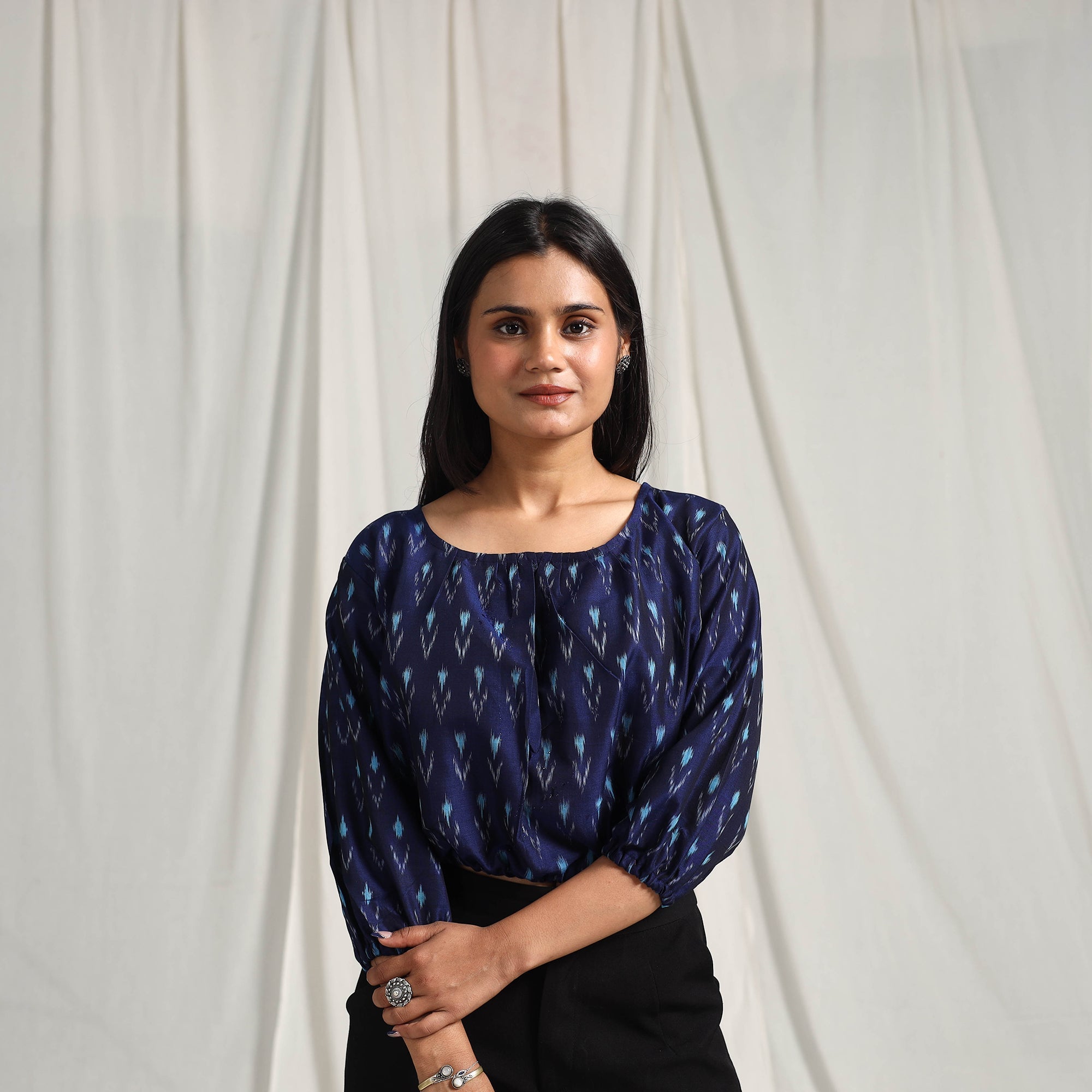 Add effortless charm to your wardrobe with this blue pochampally Ikat crop top. Made from mercerized cotton, it is comfortable, breathable, and perfect for all-day wear. The full sleeve design offers a trendy, versatile look, ideal for casual outings, festive events, or relaxed evenings.