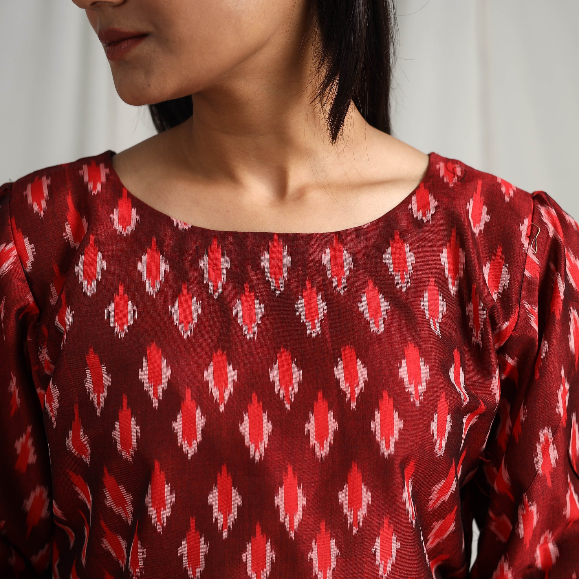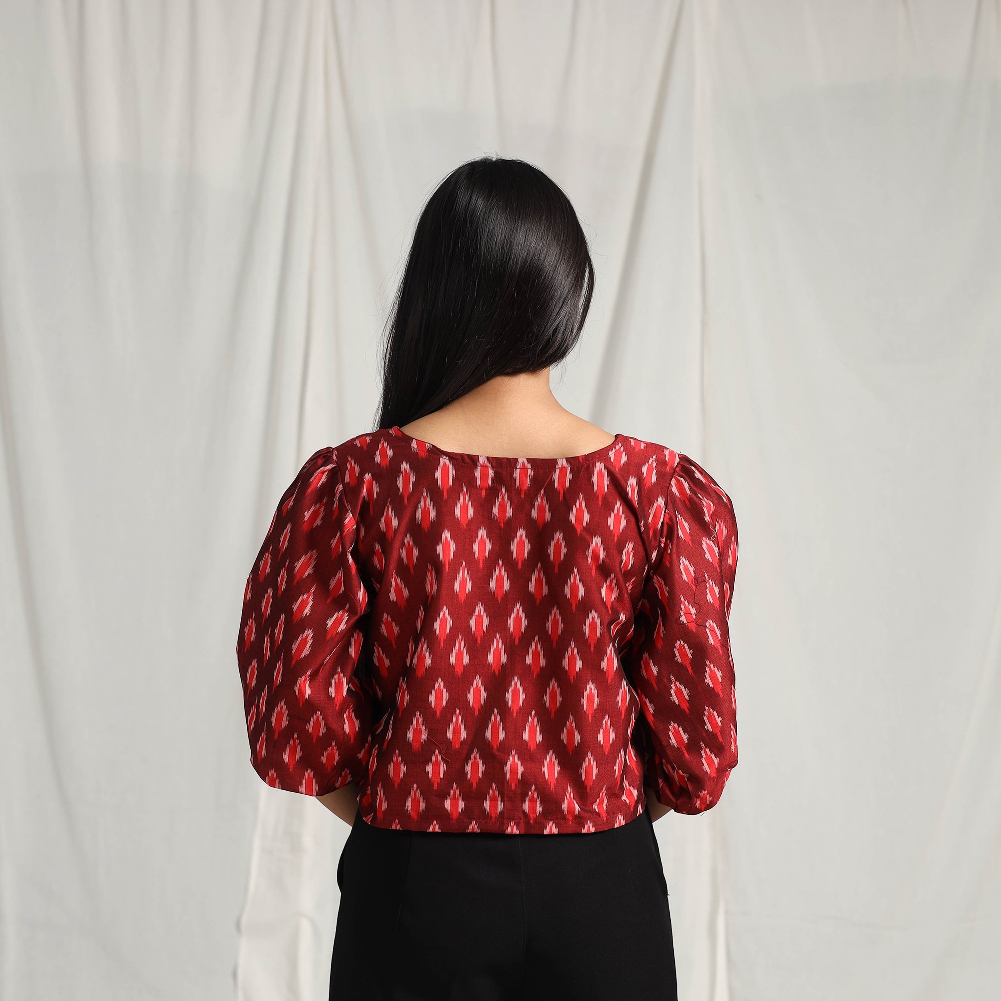 Add effortless charm to your wardrobe with this maroon pochampally Ikat crop top. Made from mercerized cotton, it is comfortable, breathable, and perfect for all-day wear. The full sleeve design offers a trendy, versatile look, ideal for casual outings, festive events, or relaxed evenings.