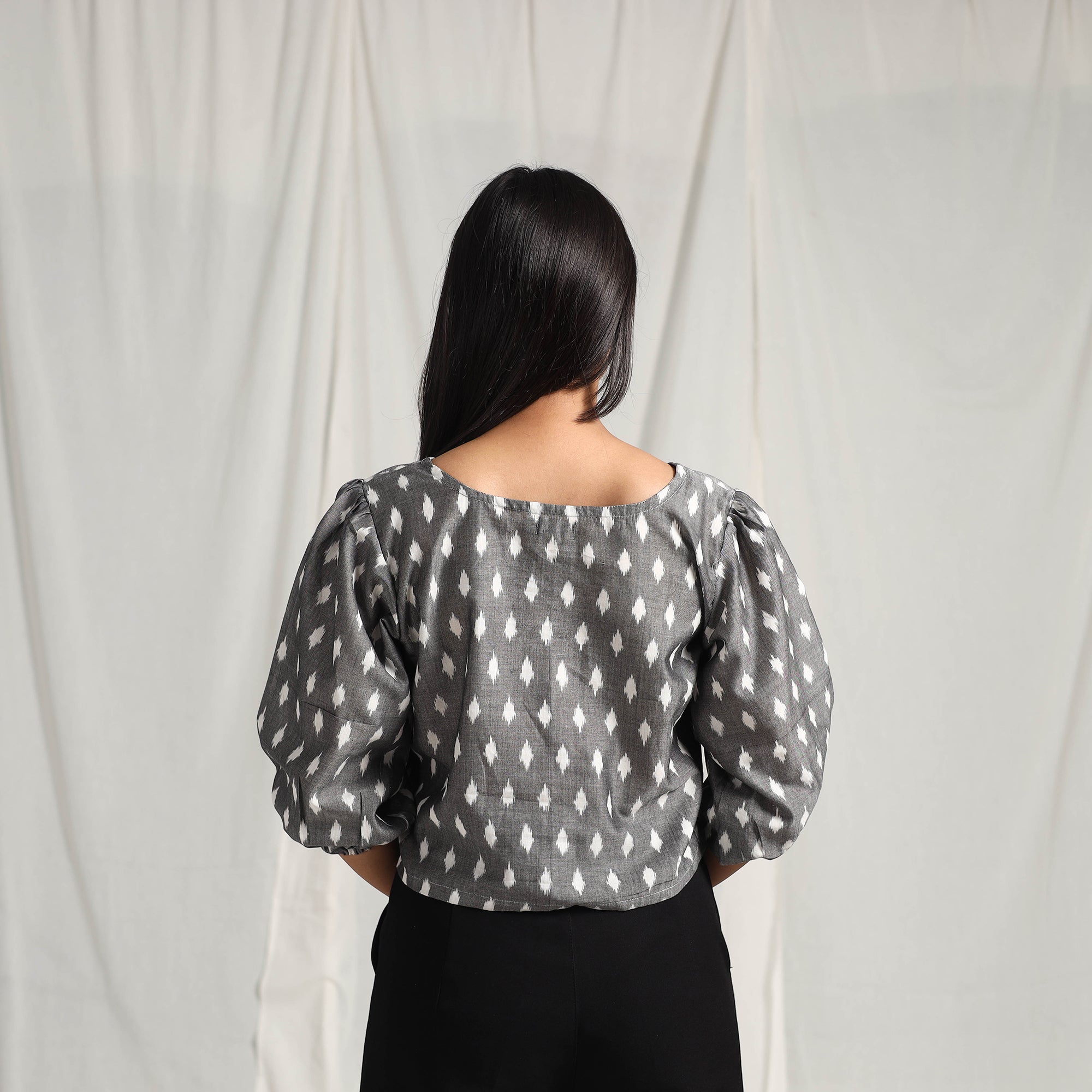 Add effortless charm to your wardrobe with this grey pochampally Ikat crop top. Made from mercerized cotton, it is comfortable, breathable, and perfect for all-day wear. The full sleeve design offers a trendy, versatile look, ideal for casual outings, festive events, or relaxed evenings.