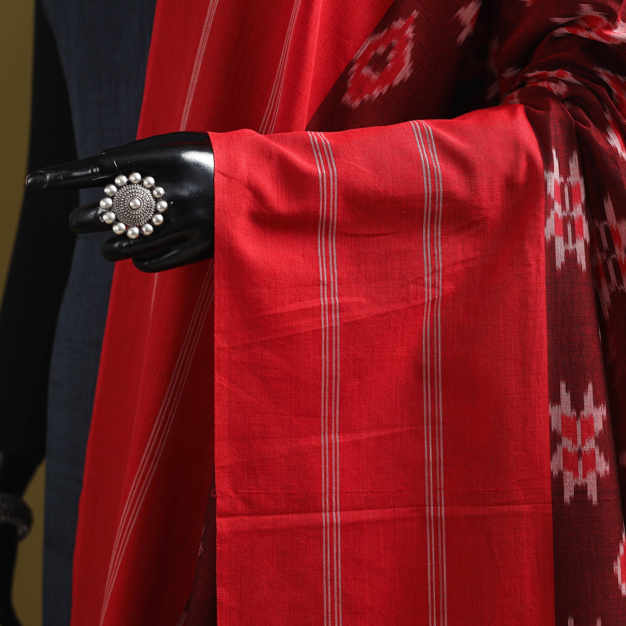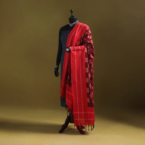 This red pochampally Ikat mercerised cotton dupatta is intricately woven by skilled artisans using the traditional resist-dyeing technique. Renowned for its detailed patterns and smooth texture, it lends a timeless charm to any outfit. Finished with delicate tassel edges, it’s perfect for festive occasions, casual gatherings, or everyday wear.