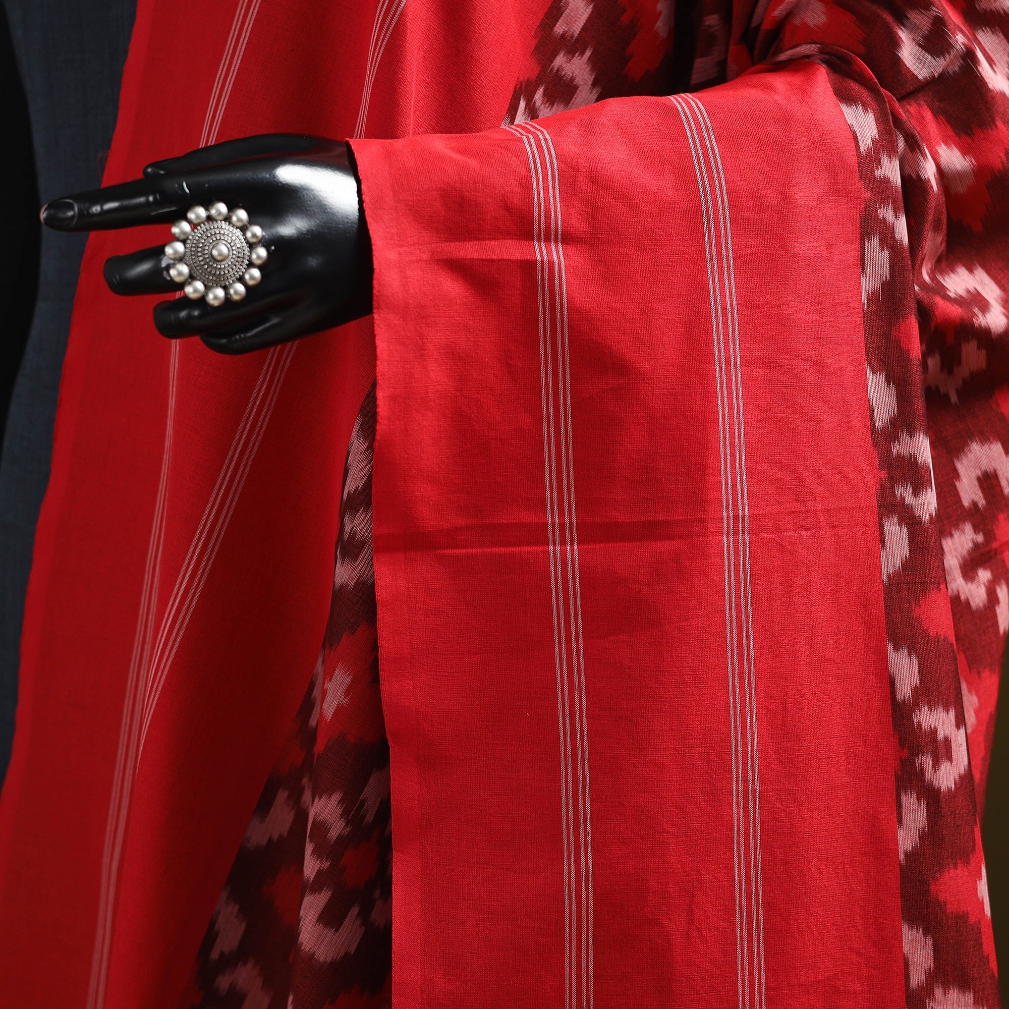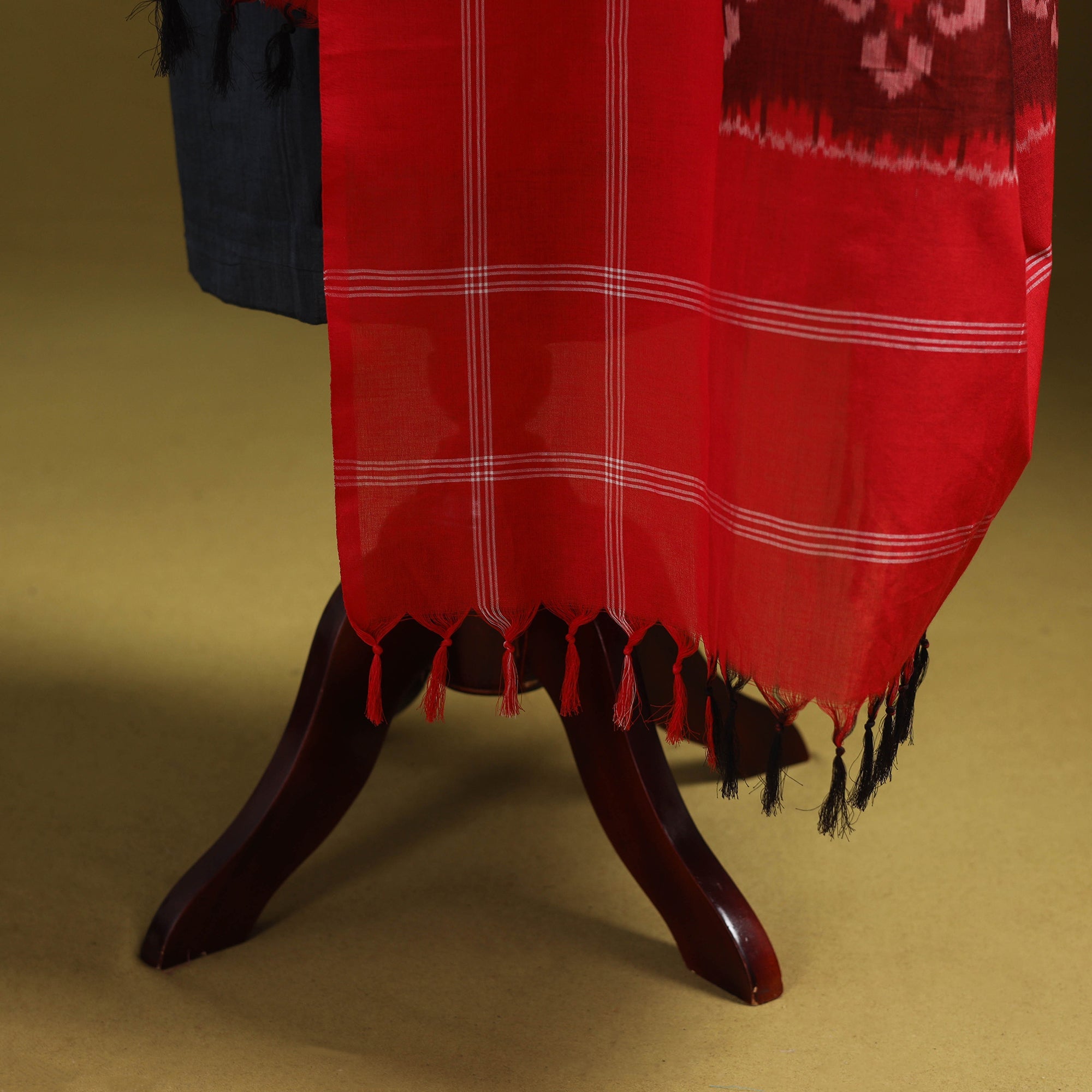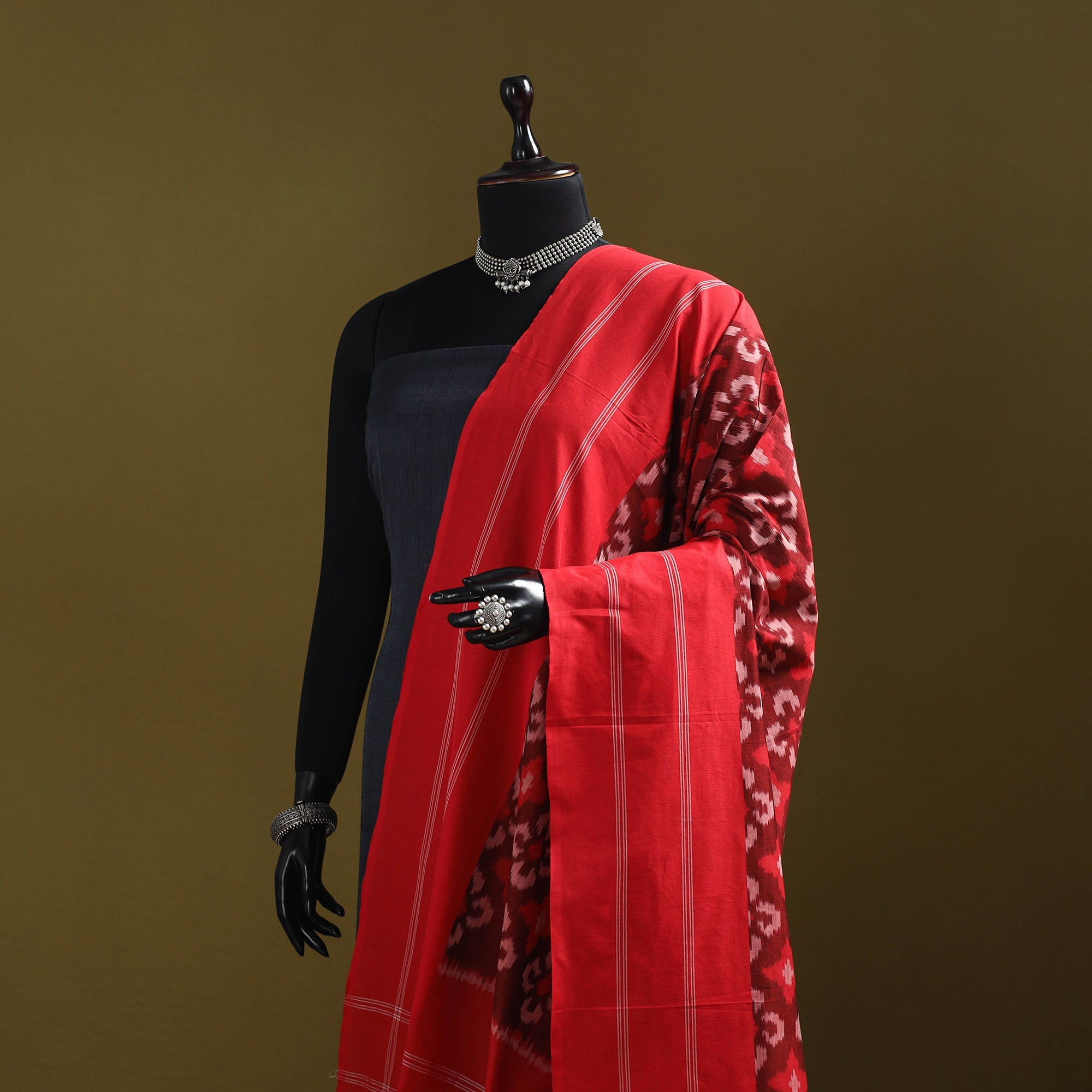 This red pochampally Ikat mercerised cotton dupatta is intricately woven by skilled artisans using the traditional resist-dyeing technique. Renowned for its detailed patterns and smooth texture, it lends a timeless charm to any outfit. Finished with delicate tassel edges, it’s perfect for festive occasions, casual gatherings, or everyday wear.