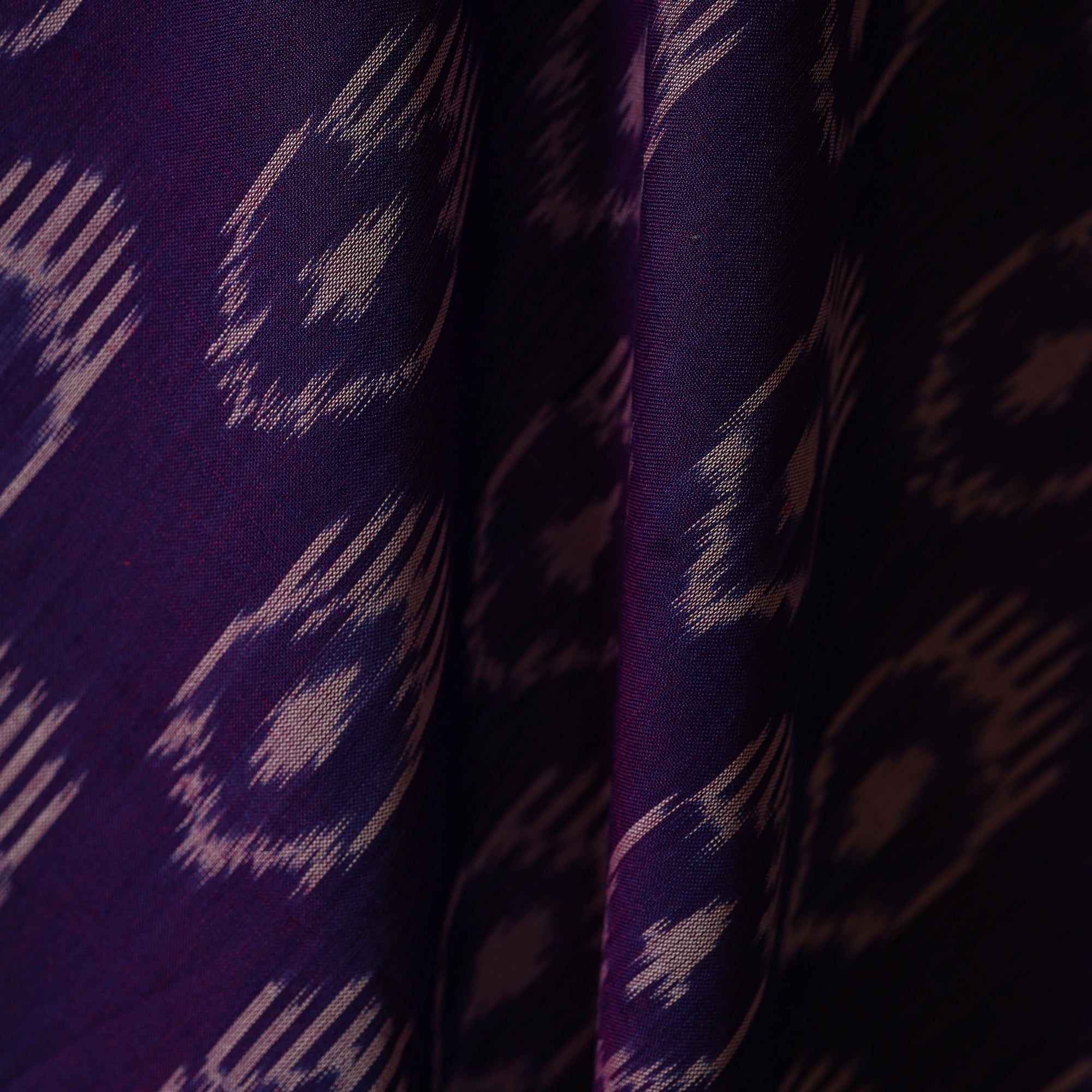 Explore purple mercerised cotton pochampally ikat fabric from Telangana. This fabric is created using the traditional resist-dyeing technique, where threads are dyed before weaving to form striking patterns. Known for its vibrant colors and smooth texture, it beautifully blends tradition with modern style. Perfect for making sarees, kurtas, home decor and creative fashion projects.